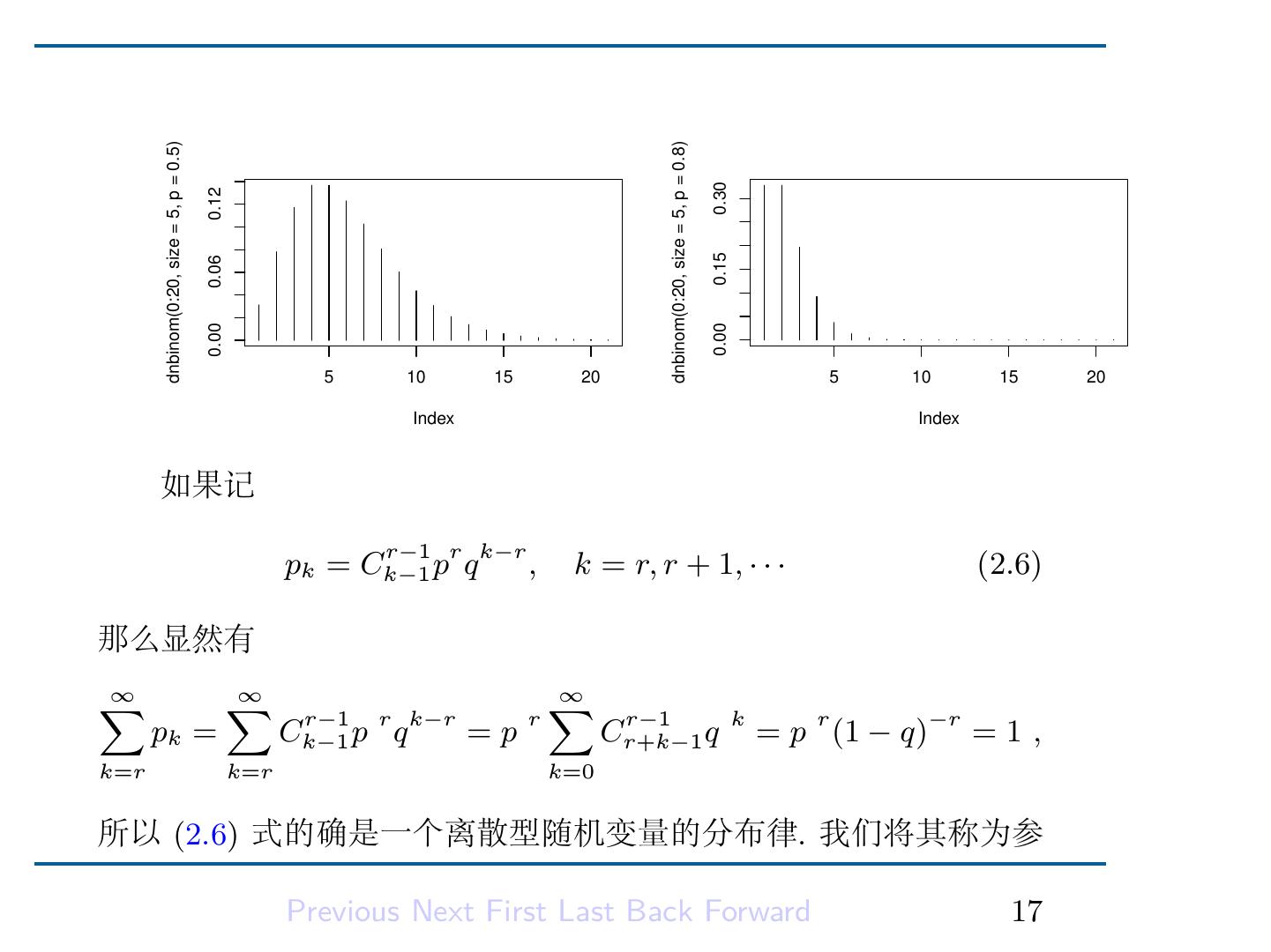 19 . dnbinom(0:20, size = 5, p = 0.5) dnbinom(0:20, size = 5, p = 0.8) 0.30 0.12 0.15 0.06 0.00 0.00 5 10 15 20 5 10 15 20 Index Index 如果记 r−1 r k−r pk = Ck−1 p q , k = r, r + 1, · · · (2.6) 那么显然有 ∑ ∞ ∑ ∞ ∑ ∞ pk = r−1 r k−r Ck−1 p q =p r r−1 Cr+k−1 q k = p r (1 − q)−r = 1 , k=r k=r k=0 所以 (2.6) 式的确是一个离散型随机变量的分布律. 我们将其称为参 Previous Next First Last Back Forward 17