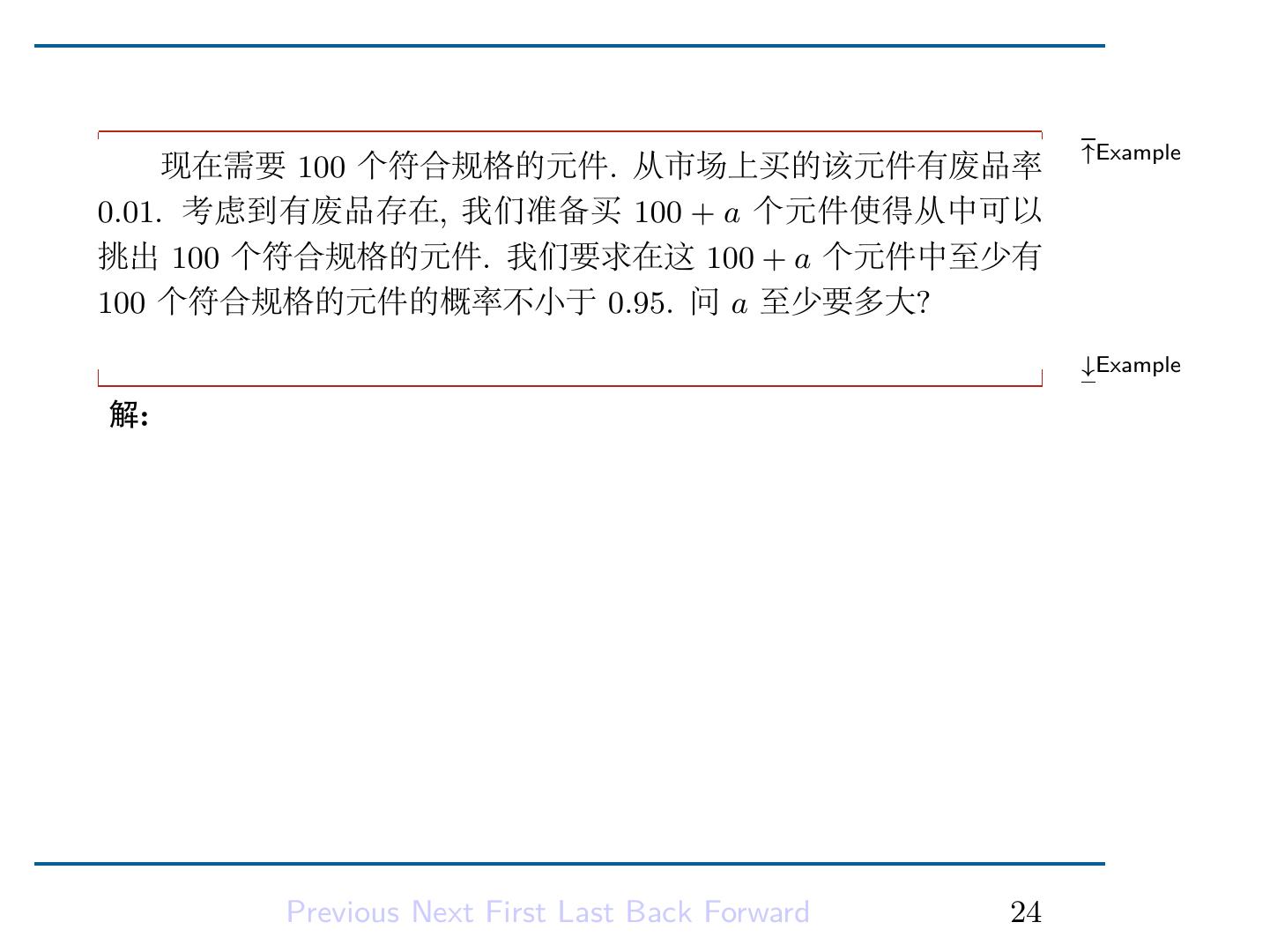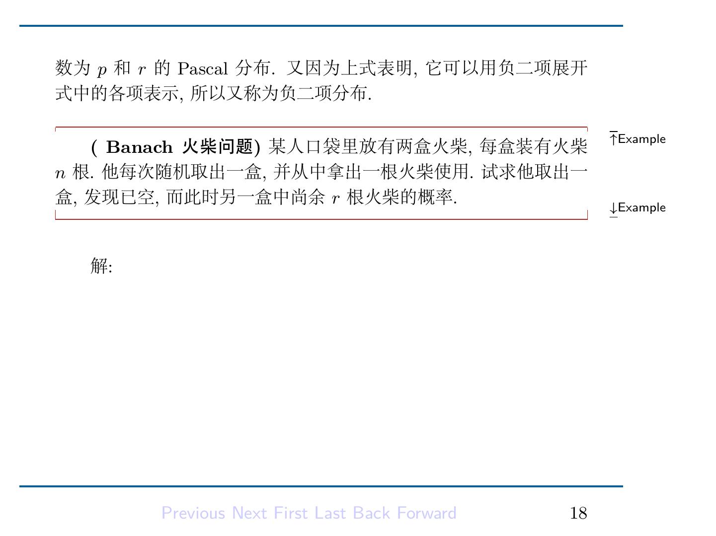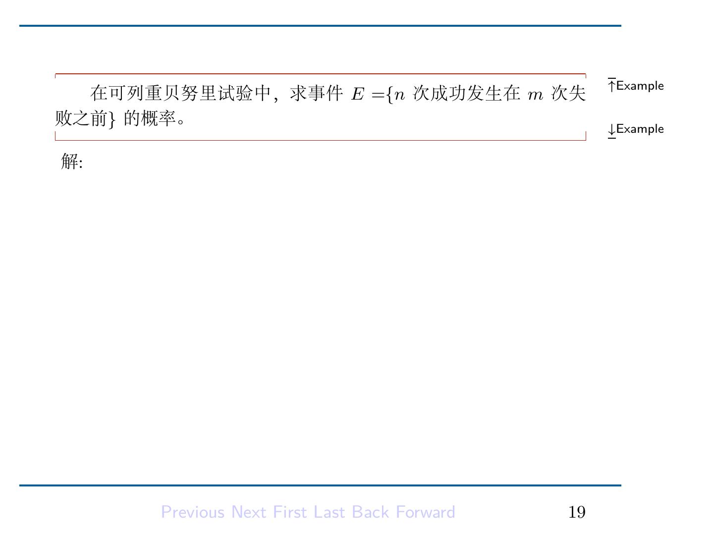 21 . ↑Example 在可列重贝努里试验中,求事件 E ={n 次成功发生在 m 次失 败之前} 的概率。 ↓Example 解: 记 Fk ={第 n 次成功发生在第 k 次试验}, 则 ∪ n+m−1 E= Fk k=n 且诸 Fk 两两互斥,故 ∑ n+m−1 ∑ n+m−1 n−1 n k−n P (E) = P (Fk ) = Ck−1 p q . k=n k=n Previous Next First Last Back Forward 19