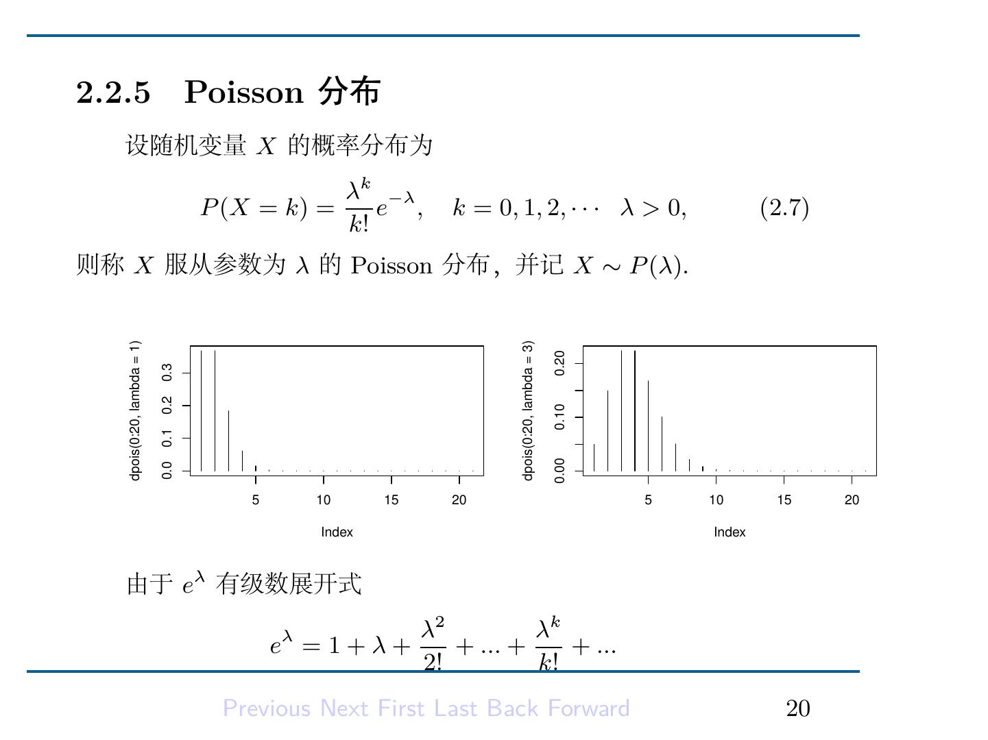 22 .2.2.5 Poisson 分布 设随机变量 X 的概率分布为 λk −λ P (X = k) = e , k = 0, 1, 2, · · · � λ > 0, (2.7) k! 则称 X 服从参数为 λ 的 Poisson 分布,并记 X ∼ P (λ). dpois(0:20, lambda = 1) dpois(0:20, lambda = 3) 0.20 0.3 0.2 0.10 0.1 0.00 0.0 5 10 15 20 5 10 15 20 Index Index 由于 eλ 有级数展开式 λ2 λk eλ = 1 + λ + + ... + + ... 2! k! Previous Next First Last Back Forward 20