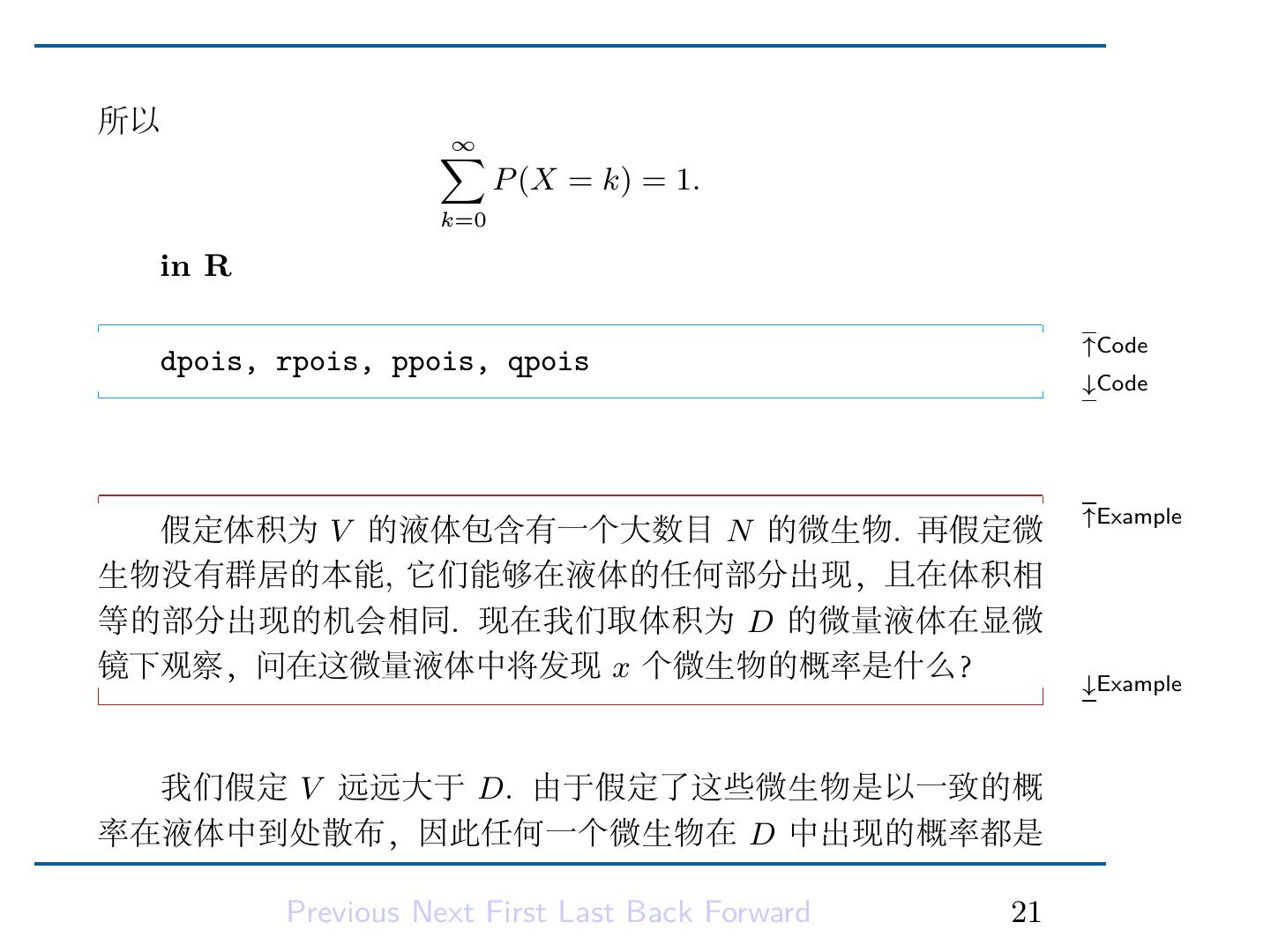 23 .所以 ∑ ∞ P (X = k) = 1. k=0 in R ↑Code dpois, rpois, ppois, qpois ↓Code ↑Example 假定体积为 V 的液体包含有一个大数目 N 的微生物. 再假定微 生物没有群居的本能, 它们能够在液体的任何部分出现,且在体积相 等的部分出现的机会相同. 现在我们取体积为 D 的微量液体在显微 镜下观察,问在这微量液体中将发现 x 个微生物的概率是什么? ↓Example 我们假定 V 远远大于 D. 由于假定了这些微生物是以一致的概 率在液体中到处散布,因此任何一个微生物在 D 中出现的概率都是 Previous Next First Last Back Forward 21