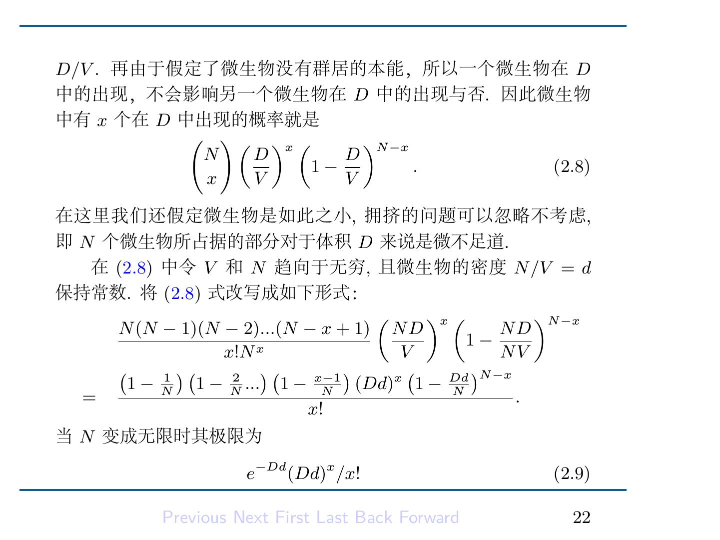 24 .D/V . 再由于假定了微生物没有群居的本能,所以一个微生物在 D 中的出现,不会影响另一个微生物在 D 中的出现与否. 因此微生物 中有 x 个在 D 中出现的概率就是 ( )( ) ( )N −x x N D D 1− . (2.8) x V V 在这里我们还假定微生物是如此之小, 拥挤的问题可以忽略不考虑, 即 N 个微生物所占据的部分对于体积 D 来说是微不足道. 在 (2.8) 中令 V 和 N 趋向于无穷, 且微生物的密度 N /V = d 保持常数. 将 (2.8) 式改写成如下形式: ( )x ( )N −x N (N − 1)(N − 2)...(N − x + 1) N D ND 1 − x!N x V NV ( ) ( )( ) ( ) Dd N −x 1 − N 1 − N ... 1 − N (Dd) 1 − N 1 2 x−1 x = . x! 当 N 变成无限时其极限为 e−Dd (Dd)x /x! (2.9) Previous Next First Last Back Forward 22