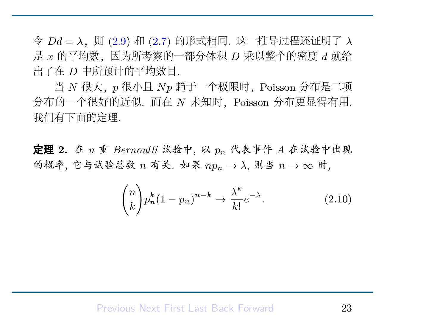 25 .令 Dd = λ,则 (2.9) 和 (2.7) 的形式相同. 这一推导过程还证明了 λ 是 x 的平均数,因为所考察的一部分体积 D 乘以整个的密度 d 就给 出了在 D 中所预计的平均数目. 当 N 很大,p 很小且 N p 趋于一个极限时,Poisson 分布是二项 分布的一个很好的近似. 而在 N 未知时,Poisson 分布更显得有用. 我们有下面的定理. 定理 2. 在 n 重 Bernoulli 试验中, 以 pn 代表事件 A 在试验中出现 的概率, 它与试验总数 n 有关. 如果 npn → λ, 则当 n → ∞ 时, ( ) n k λk −λ pn (1 − pn )n−k → e . (2.10) k k! Previous Next First Last Back Forward 23