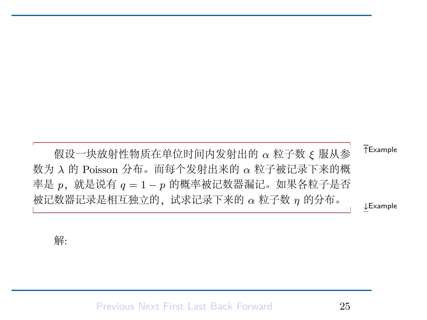 27 .似上述概率. 因而 ∑ a P (A) = e−1 /i!. i=0 当 a = 0, 1, 2, 3 时, 上式右边分别为 0.368, 0.736, 0.920 和 0.981. 故 取 a = 3 已够了. ↑Example 假设一块放射性物质在单位时间内发射出的 α 粒子数 ξ 服从参 数为 λ 的 Poisson 分布。而每个发射出来的 α 粒子被记录下来的概 率是 p,就是说有 q = 1 − p 的概率被记数器漏记。如果各粒子是否 被记数器记录是相互独立的,试求记录下来的 α 粒子数 η 的分布。 ↓Example 解: 以事件 {ξ = n}, n = 0, 1, 2, · · · 为划分,则由全概率公式有 Previous Next First Last Back Forward 25