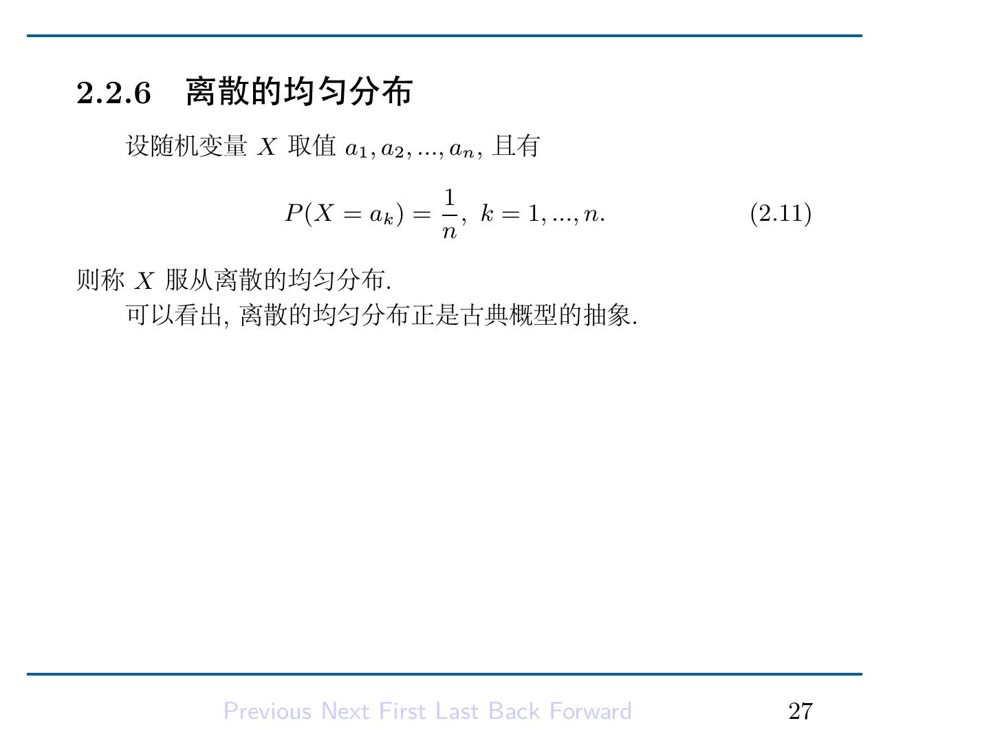 29 .2.2.6 离散的均匀分布 设随机变量 X 取值 a1 , a2 , ..., an , 且有 1 P (X = ak ) = , k = 1, ..., n. (2.11) n 则称 X 服从离散的均匀分布. 可以看出, 离散的均匀分布正是古典概型的抽象. Previous Next First Last Back Forward 27