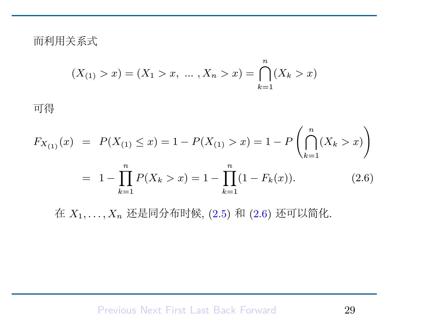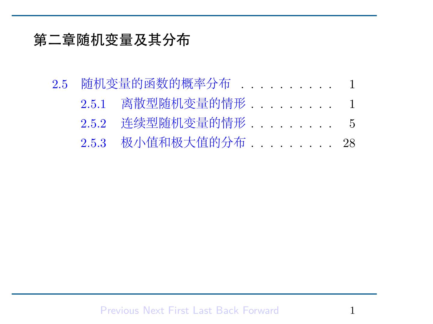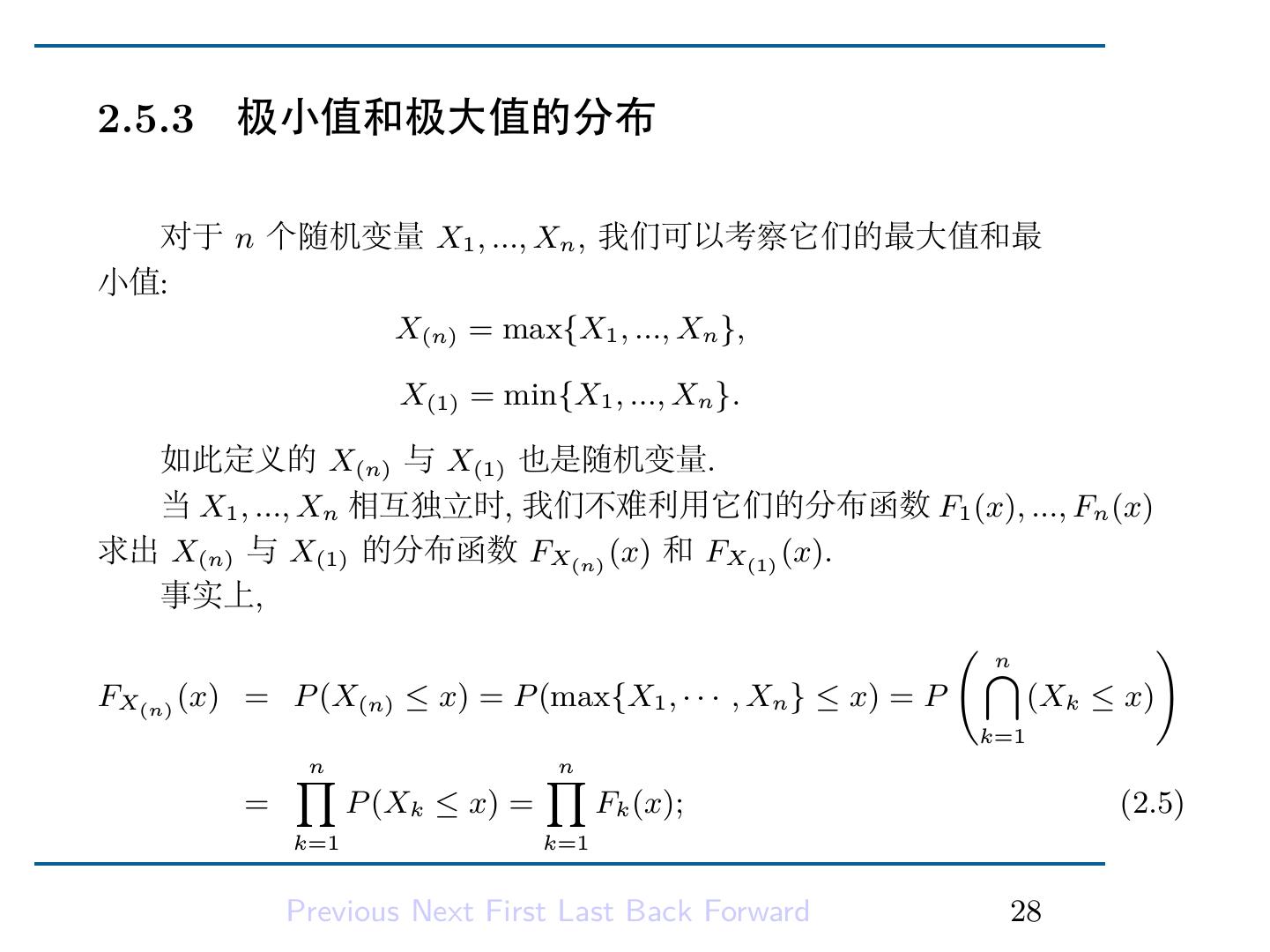 2 .第二章随机变量及其分布 2.5 随机变量的函数的概率分布 . . . . . . . . . . 1 2.5.1 离散型随机变量的情形 . . . . . . . . . 1 2.5.2 连续型随机变量的情形 . . . . . . . . . 5 2.5.3 极小值和极大值的分布 . . . . . . . . . 28 Previous Next First Last Back Forward 1