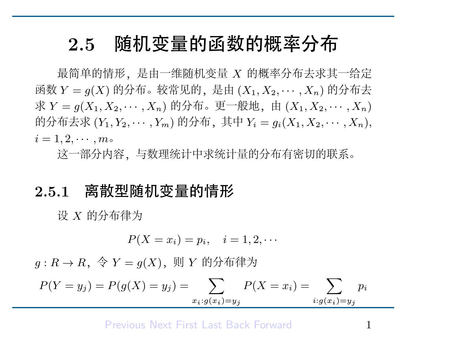 3 . 2.5 随机变量的函数的概率分布 最简单的情形,是由一维随机变量 X 的概率分布去求其一给定 函数 Y = g(X) 的分布。较常见的,是由 (X1 , X2 , · · · , Xn ) 的分布去 求 Y = g(X1 , X2 , · · · , Xn ) 的分布。更一般地,由 (X1 , X2 , · · · , Xn ) 的分布去求 (Y1 , Y2 , · · · , Ym ) 的分布,其中 Yi = gi (X1 , X2 , · · · , Xn ), i = 1, 2, · · · , m。 这一部分内容,与数理统计中求统计量的分布有密切的联系。 2.5.1 离散型随机变量的情形 设 X 的分布律为 P (X = xi ) = pi , i = 1, 2, · · · g : R → R,令 Y = g(X),则 Y 的分布律为 ∑ ∑ P (Y = yj ) = P (g(X) = yj ) = P (X = xi ) = pi xi :g(xi )=yj i:g(xi )=yj Previous Next First Last Back Forward 1