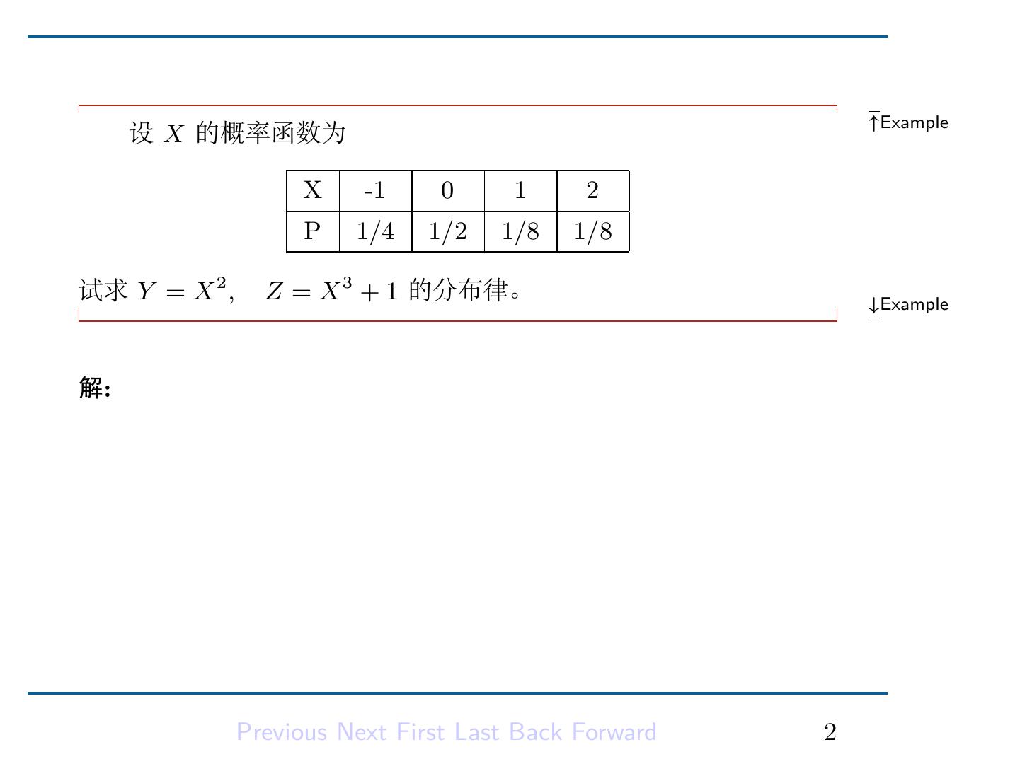 4 . ↑Example 设 X 的概率函数为 X -1 0 1 2 P 1/4 1/2 1/8 1/8 试求 Y = X 2 , Z = X 3 + 1 的分布律。 ↓Example 解: 容易求得 Y 的分布律为: Y 0 1 4 P 1/2 3/8 1/8 Z 的分布律 Z 0 1 2 9 P 1/4 1/2 1/8 1/8 Previous Next First Last Back Forward 2