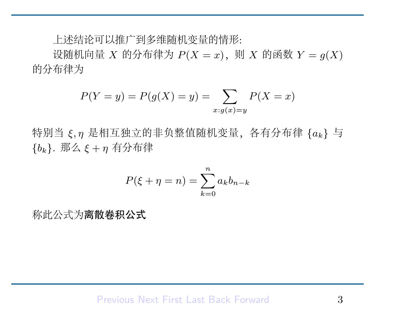 5 . 上述结论可以推广到多维随机变量的情形: 设随机向量 X 的分布律为 P (X = x),则 X 的函数 Y = g(X) 的分布律为 ∑ P (Y = y) = P (g(X) = y) = P (X = x) x:g(x)=y 特别当 ξ, η 是相互独立的非负整值随机变量,各有分布律 {ak } 与 {bk }. 那么 ξ + η 有分布律 ∑ n P (ξ + η = n) = ak bn−k k=0 称此公式为离散卷积公式 Previous Next First Last Back Forward 3