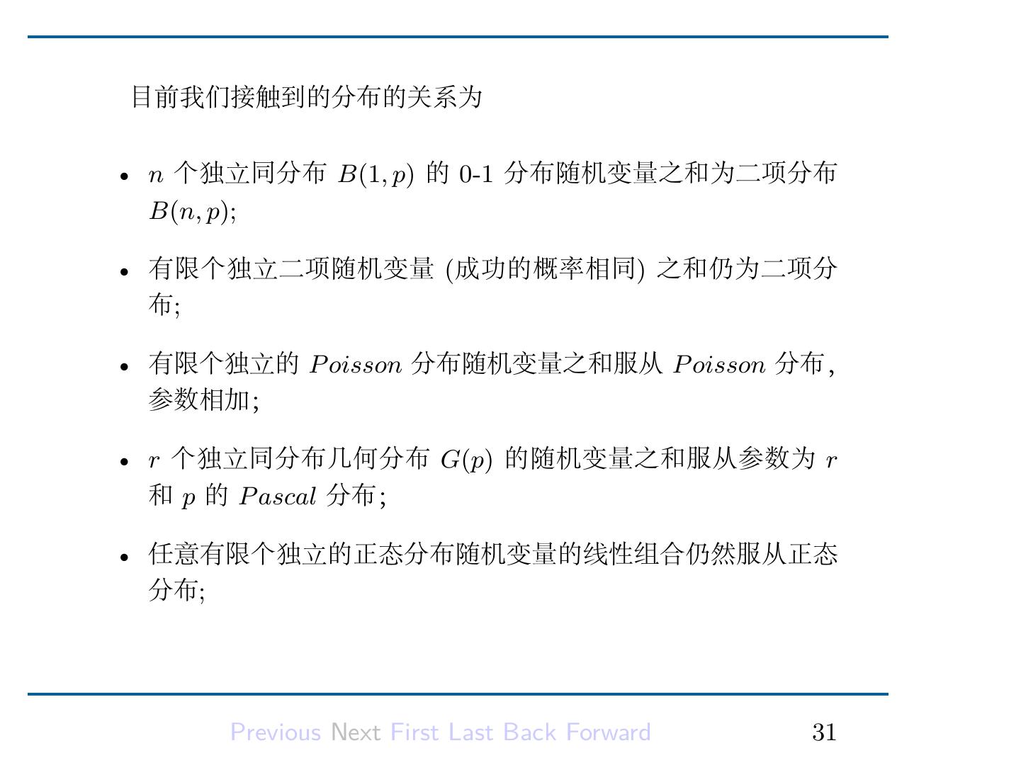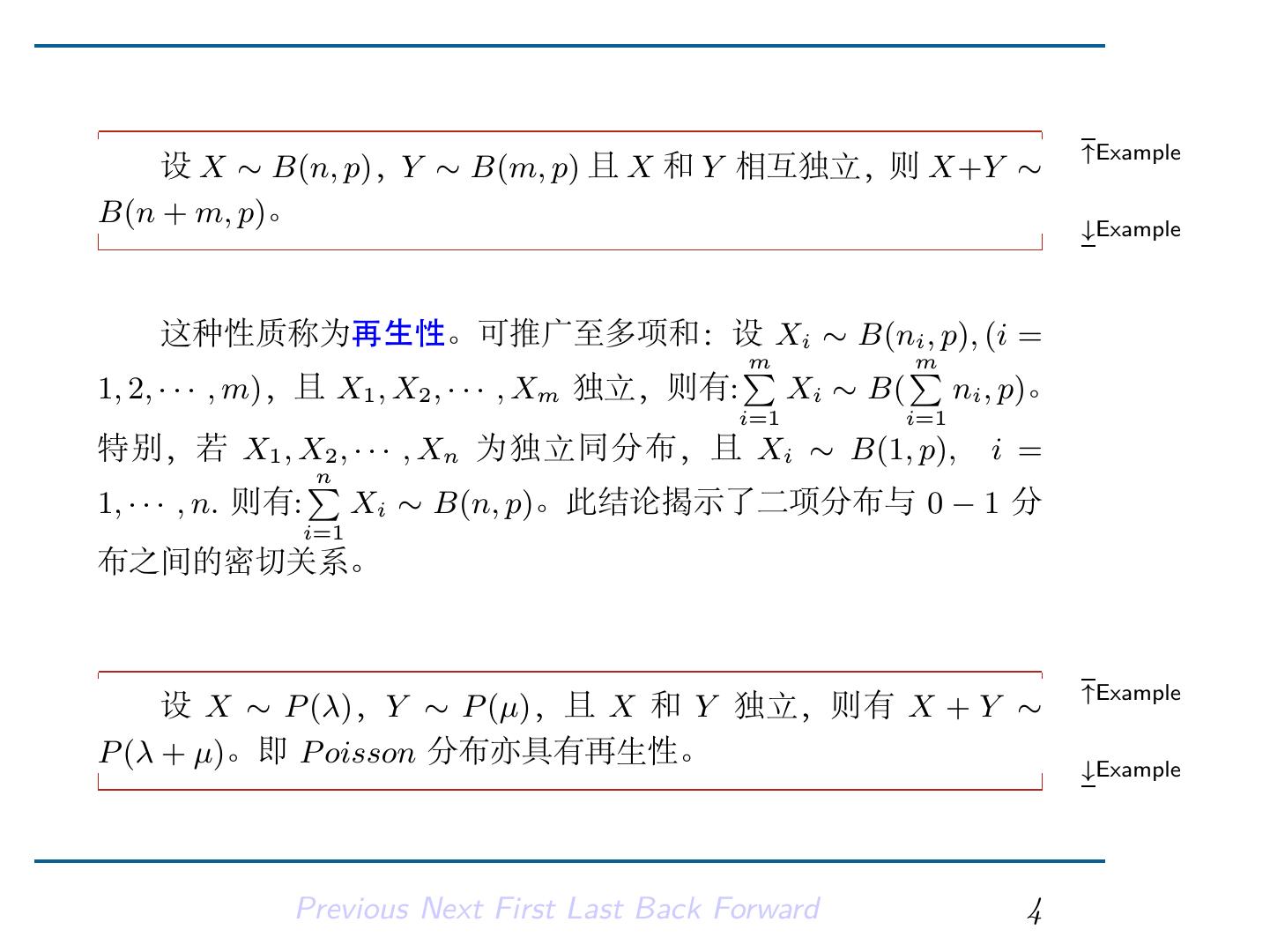 6 . ↑Example 设 X ∼ B(n, p),Y ∼ B(m, p) 且 X 和 Y 相互独立,则 X+Y ∼ B(n + m, p)。 ↓Example 这种性质称为再生性。可推广至多项和:设 Xi ∼ B(ni , p), (i = ∑ m ∑ m 1, 2, · · · , m),且 X1 , X2 , · · · , Xm 独立,则有: Xi ∼ B( ni , p)。 i=1 i=1 特别,若 X1 , X2 , · · · , Xn 为独立同分布,且 Xi ∼ B(1, p), i = ∑ n 1, · · · , n. 则有: Xi ∼ B(n, p)。此结论揭示了二项分布与 0 − 1 分 i=1 布之间的密切关系。 ↑Example 设 X ∼ P (λ),Y ∼ P (µ),且 X 和 Y 独立,则有 X + Y ∼ P (λ + µ)。即 P oisson 分布亦具有再生性。 ↓Example Previous Next First Last Back Forward 4