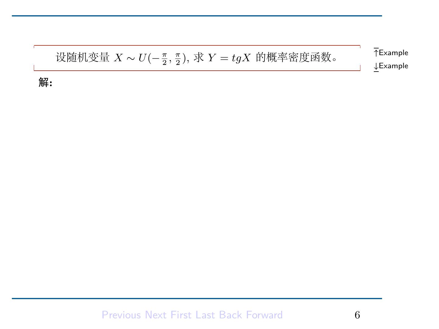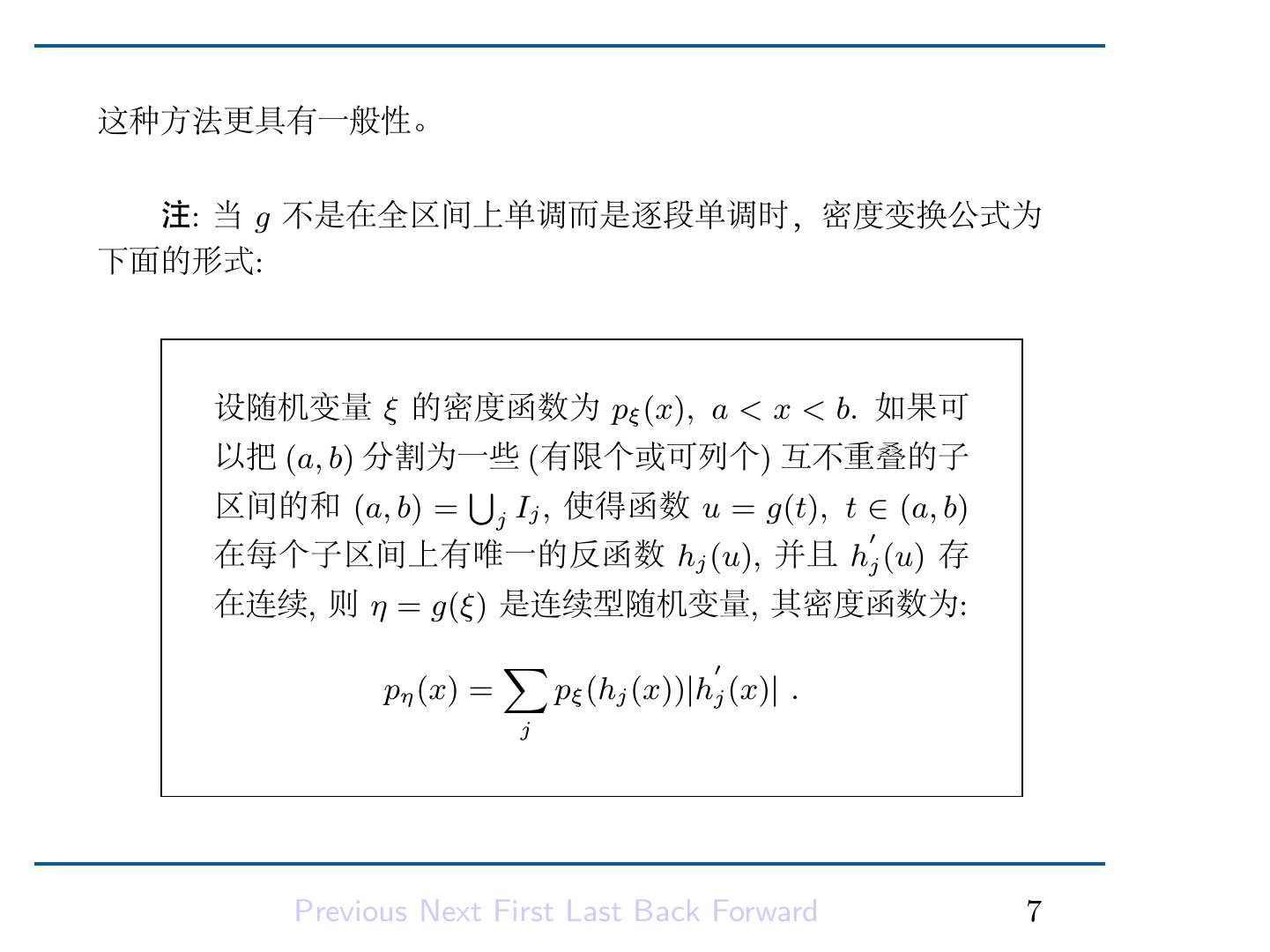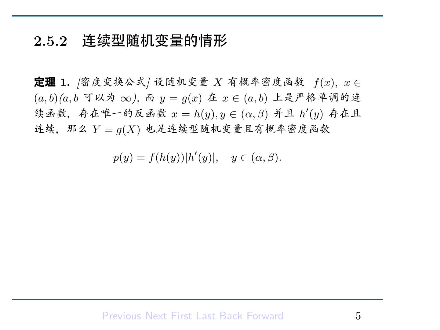 7 .2.5.2 连续型随机变量的情形 定理 1. [密度变换公式] 设随机变量 X 有概率密度函数 f (x), x ∈ (a, b)(a, b 可以为 ∞), 而 y = g(x) 在 x ∈ (a, b) 上是严格单调的连 续函数,存在唯一的反函数 x = h(y), y ∈ (α, β) 并且 h′ (y) 存在且 连续,那么 Y = g(X) 也是连续型随机变量且有概率密度函数 p(y) = f (h(y))|h′ (y)|, y ∈ (α, β). Previous Next First Last Back Forward 5