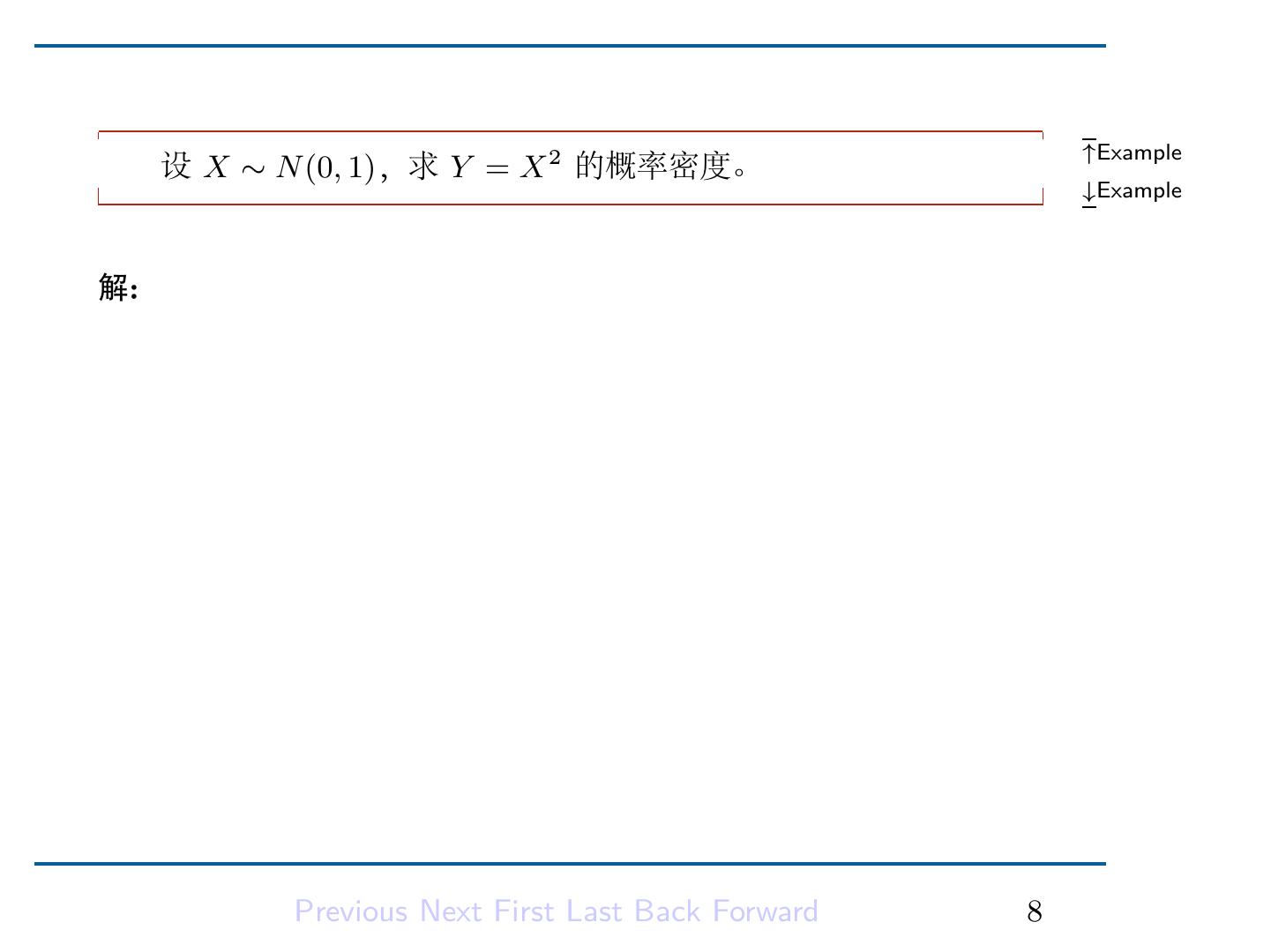 10 . ↑Example 设 X ∼ N (0, 1),求 Y = X 2 的概率密度。 ↓Example 解: 由于函数 y = x2 在 (−∞, 0) 和 [0, ∞) 上严格单调,因此由上述 定理知 Y 的概率密度为 √ √ √ √ f (y) = ϕ(− y)| − y ′ |I{y>0} + ϕ( y)| y ′ |I{y>0} 1 1 y = √ y − 2 e− 2 I{y>0} 2π Previous Next First Last Back Forward 8