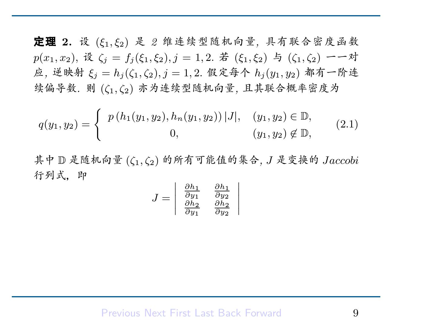 11 .定理 2. 设 (ξ1 , ξ2 ) 是 2 维连续型随机向量, 具有联合密度函数 p(x1 , x2 ), 设 ζj = fj (ξ1 , ξ2 ), j = 1, 2. 若 (ξ1 , ξ2 ) 与 (ζ1 , ζ2 ) 一一对 应, 逆映射 ξj = hj (ζ1 , ζ2 ), j = 1, 2. 假定每个 hj (y1 , y2 ) 都有一阶连 续偏导数. 则 (ζ1 , ζ2 ) 亦为连续型随机向量, 且其联合概率密度为 { p (h1 (y1 , y2 ), hn (y1 , y2 )) |J|, (y1 , y2 ) ∈ D, q(y1 , y2 ) = (2.1) 0, (y1 , y2 ) ̸∈ D, 其中 D 是随机向量 (ζ1 , ζ2 ) 的所有可能值的集合, J 是变换的 Jaccobi 行列式,即 ∂h1 ∂h1 ∂y1 ∂y2 J= ∂h2 ∂h2 ∂y1 ∂y2 Previous Next First Last Back Forward 9