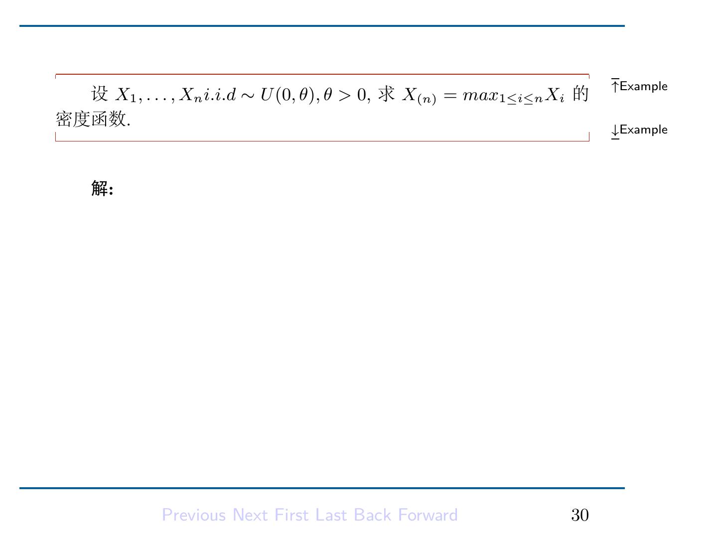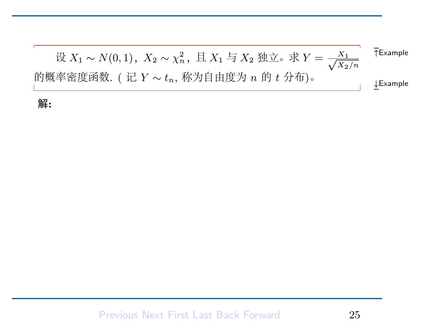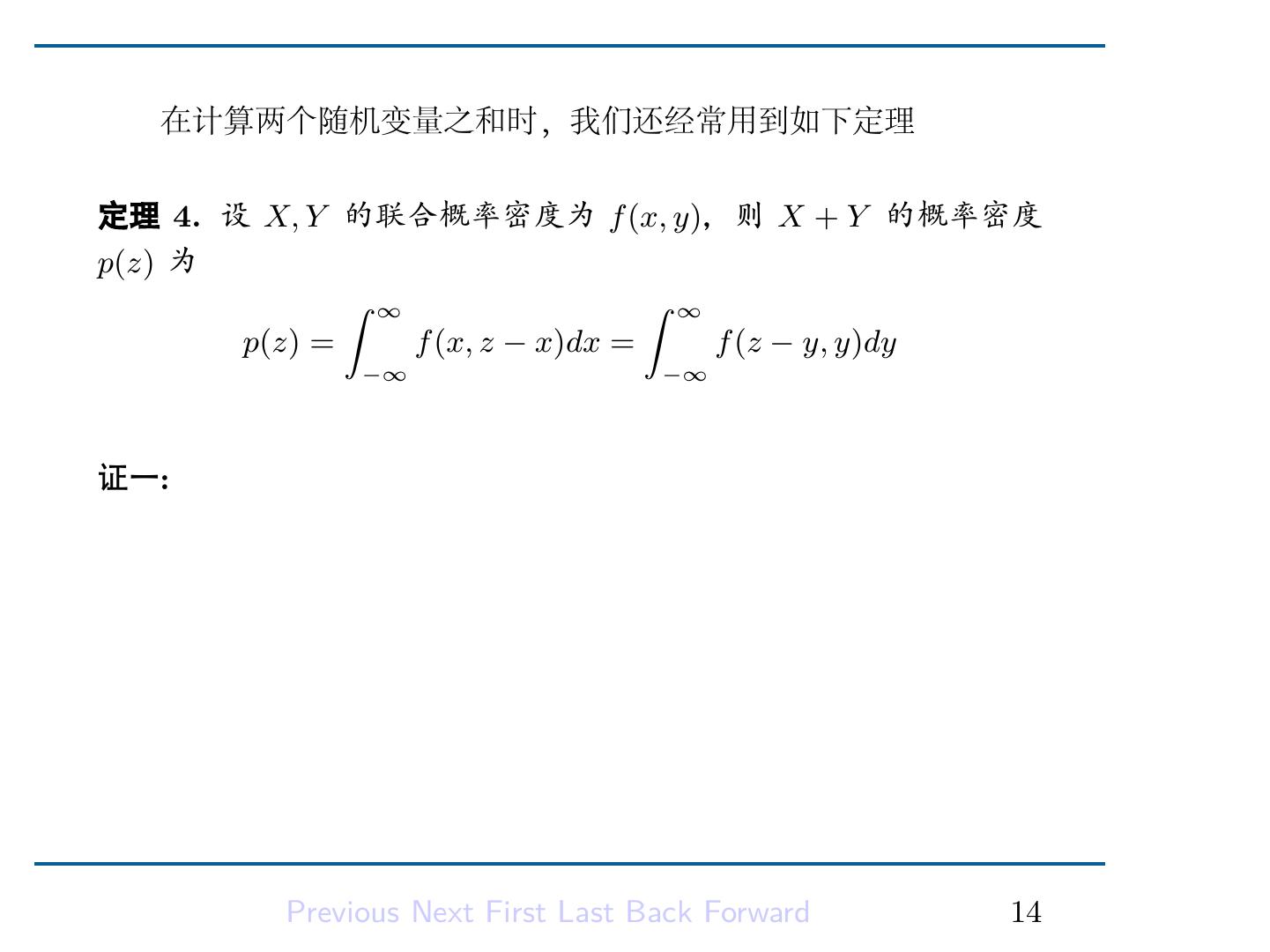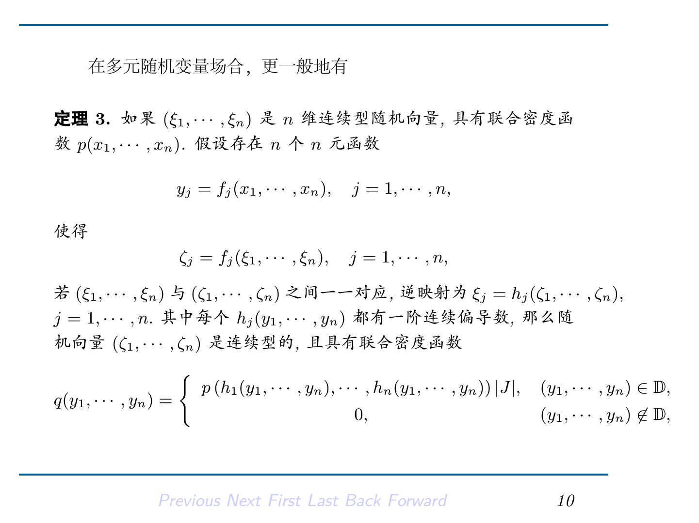 13 . 其中 D 是随机向量 (ζ1 , · · · , ζn ) 的所有可能值的集合, J 是变换 的 Jaccobi 行列式,即 ∂h1 ∂y1 ··· ∂h1 ∂yn .. .. .. J= . . . ∂hn ∂y1 ··· ∂hn ∂yn Previous Next First Last Back Forward 11