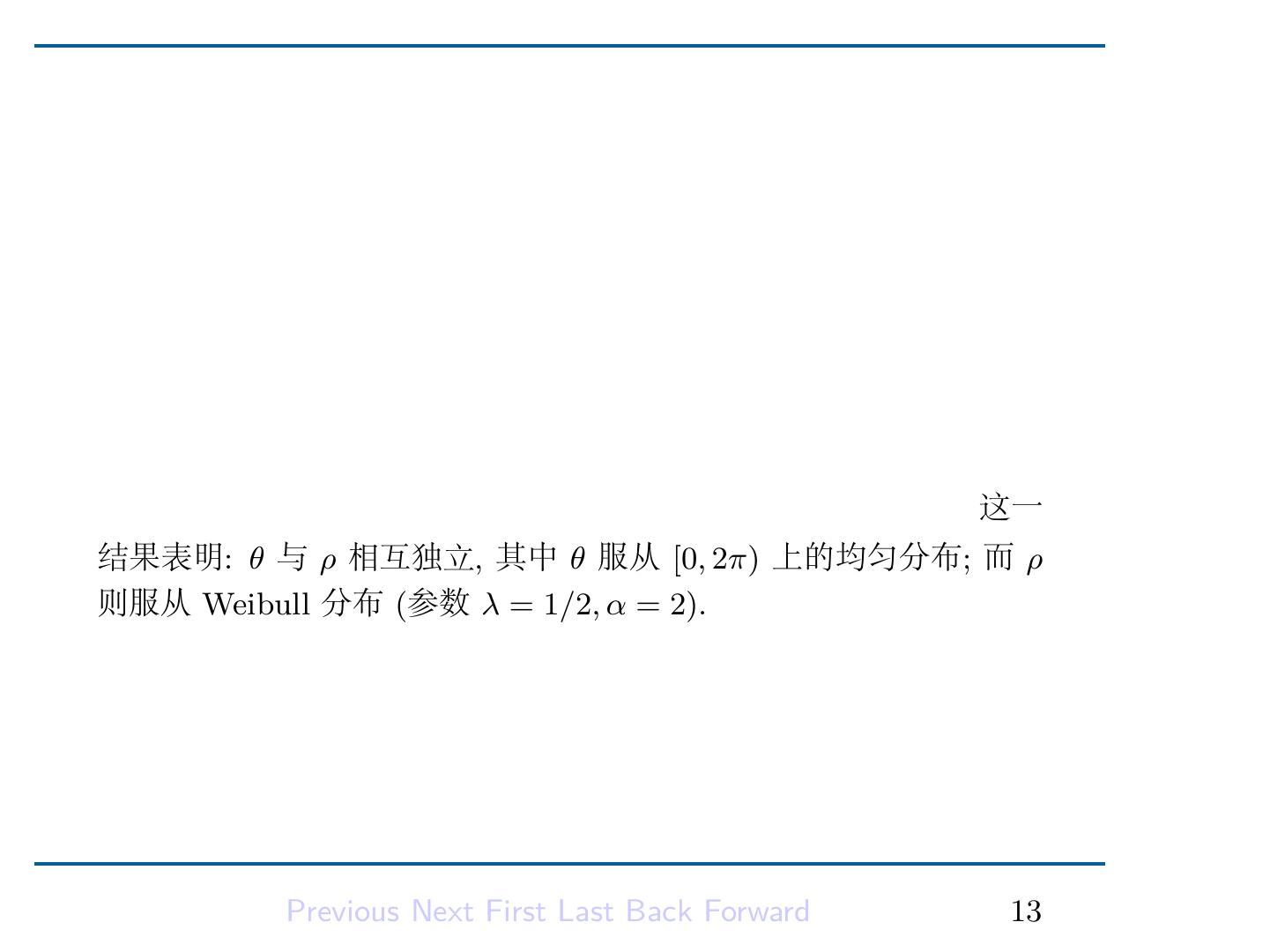 15 .由于 (ξ, η) 的联合密度为 { } 1 x2 + y 2 p(x, y) = exp − , 2π 2 所以由 (??) 式得知, (ρ, θ) 的联合密度为 { 2} 1 r q(r, t) = r exp − = q1 (r)q2 (t), r > 0, t ∈ [0, 2π). (2.3) 2π 2 { 2} 其中 q1 (r) = r exp − r2 , r > 0; q2 (t) = 1 2π ,t ∈ [0, 2π). 这一 结果表明: θ 与 ρ 相互独立, 其中 θ 服从 [0, 2π) 上的均匀分布; 而 ρ 则服从 Weibull 分布 (参数 λ = 1/2, α = 2). Previous Next First Last Back Forward 13