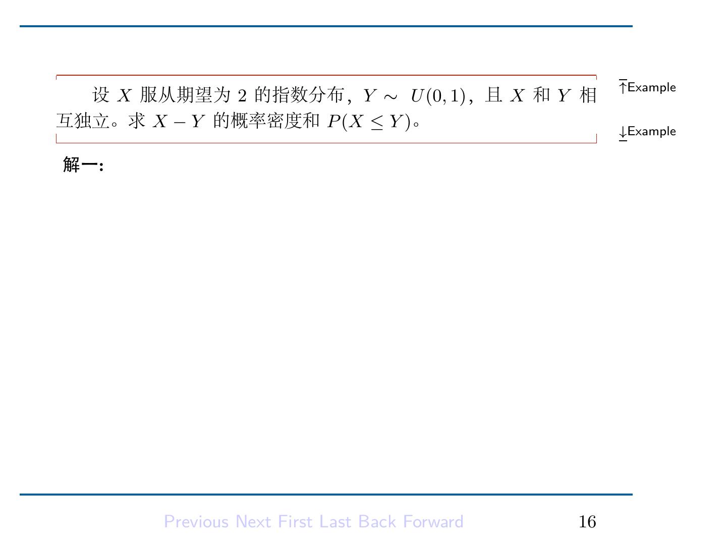 18 . ↑Example 设 X 服从期望为 2 的指数分布,Y ∼ U (0, 1),且 X 和 Y 相 互独立。求 X − Y 的概率密度和 P (X ≤ Y )。 ↓Example 解一: 由题设知 −Y ∼ U (−1, 0),并记 X 和 −Y 的密度分别为 f1 和 f2 ,从而由卷积公式有 ∫ ∞ fX−Y (z) = f1 (x)f2 (z − x)dx −∞ −z −1 e 2 (1 − e 2 ), z+1 z≥0 = 1 − e− 2 , −1 < z < 0 0, z ≤ −1 1 所以 P (X ≤ Y ) = P (X − Y ≤ 0) = 2e− 2 − 1。 Previous Next First Last Back Forward 16
