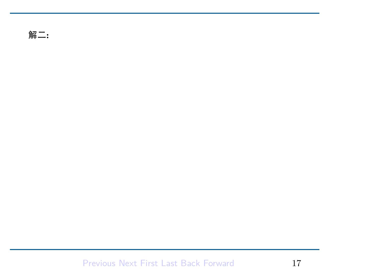 19 .解二: 由于 ∫ P (X − Y ≤ z) = P (X ≤ z + y|Y = y)f (y)dy ∫ 1 ∫ 0 P (X ≤ z + y)dy z≥0 1 = P (X ≤ z + y)dy −1 < z < 0 −z 0 z ≤ −1 −z/2 (1 − e−1/2 ), 1 − 2e z≥0 −(z+1)/2 = z + 2e − 1, −1 < z < 0 0, z ≤ −1 再对分布函数求导数即得所求. Previous Next First Last Back Forward 17