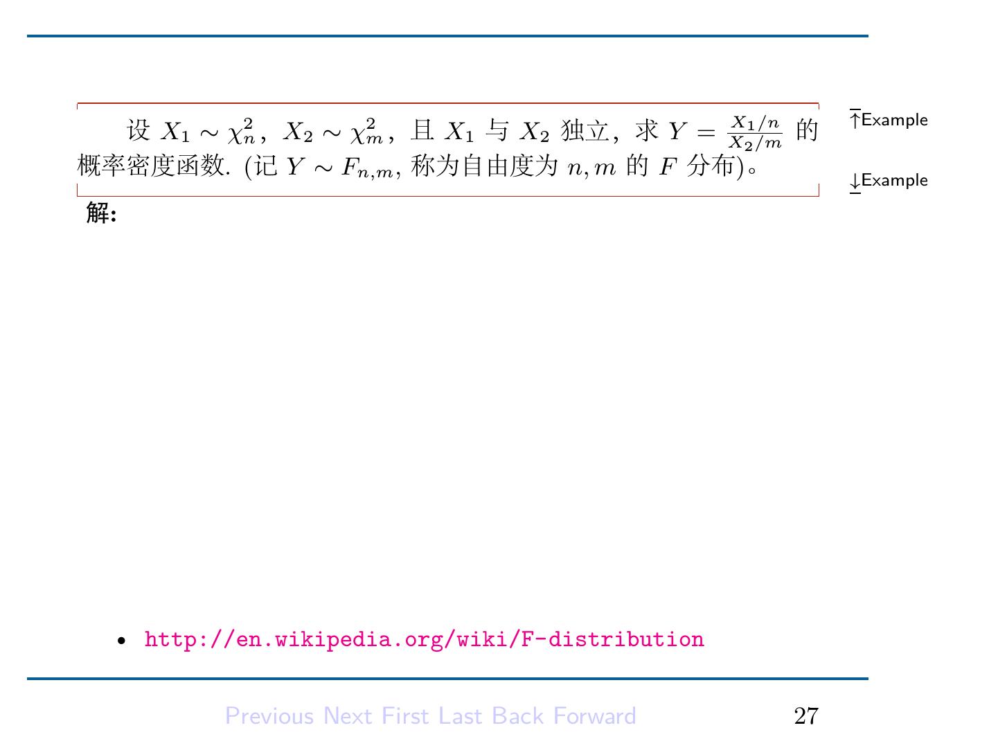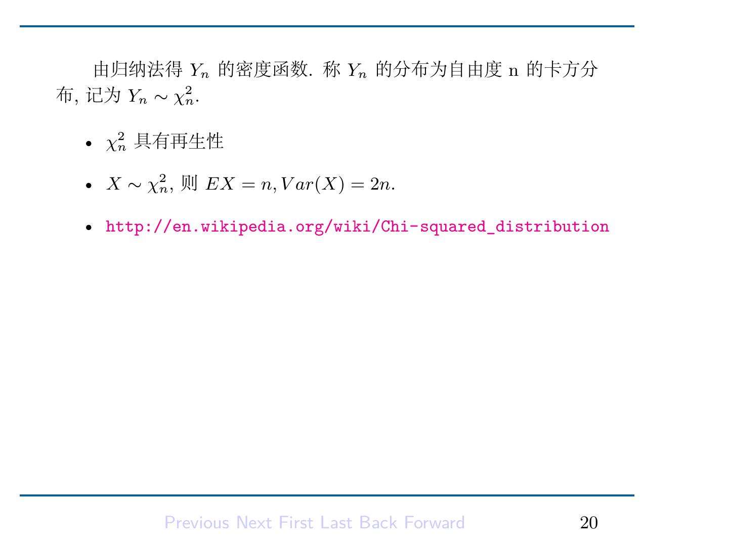 22 . 由归纳法得 Yn 的密度函数. 称 Yn 的分布为自由度 n 的卡方分 布, 记为 Yn ∼ χ2n . • χ2n 具有再生性 • X ∼ χ2n , 则 EX = n, V ar(X) = 2n. • http://en.wikipedia.org/wiki/Chi-squared_distribution Previous Next First Last Back Forward 20