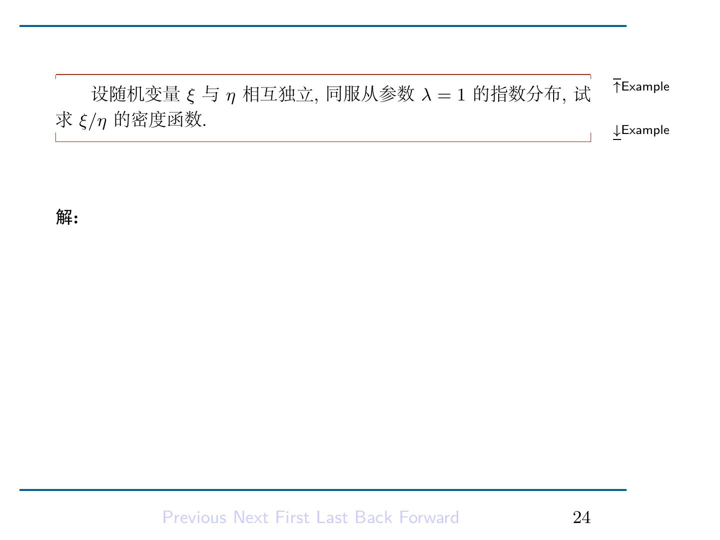26 . ↑Example 设随机变量 ξ 与 η 相互独立, 同服从参数 λ = 1 的指数分布, 试 求 ξ/η 的密度函数. ↓Example 解: 我们利用 (2.4) 式求 p ξ (x). 由于 (ξ, η) 的联合密度为 η p(u, v) = e−u−v , u > 0, v > 0, 所以欲 (2.4) 式中的被积函数 |t|p(xt, t) ̸= 0, 当且仅当, t > 0 和 xt > 0, 从而知有 { ∫∞ 0 t e−xt−t dt = 1 (1+x)2 x > 0; p ξ (x) = η 0 x ≤ 0. 易见 p η (x) 同上。 ξ Previous Next First Last Back Forward 24