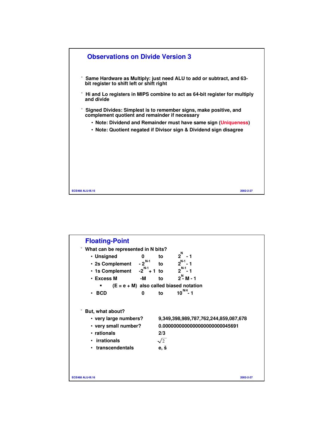 5 . Observations on Divide Version 1 °1/2 bits in divisor always 0 => 1/2 of 64-bit adder is wasted => 1/2 of divisor is wasted °Instead of shifting divisor to right, shift remainder to left? °1st step cannot produce a 1 in quotient bit ( otherwise too big) => switch order to shift first and then subtract, can save 1 iteration ECE468 ALU-III.9 2002-2-27 DIVIDE HARDWARE Version 2 °32-bit Divisor reg, 32 -bit ALU, 64-bit Remainder reg, 32-bit Quotient reg Divisor 32 bits Quotient 32-bit ALU Shift Left 32 bits Remainder Shift Left Write Control 64 bits ECE468 ALU-III.10 2002-2-27
