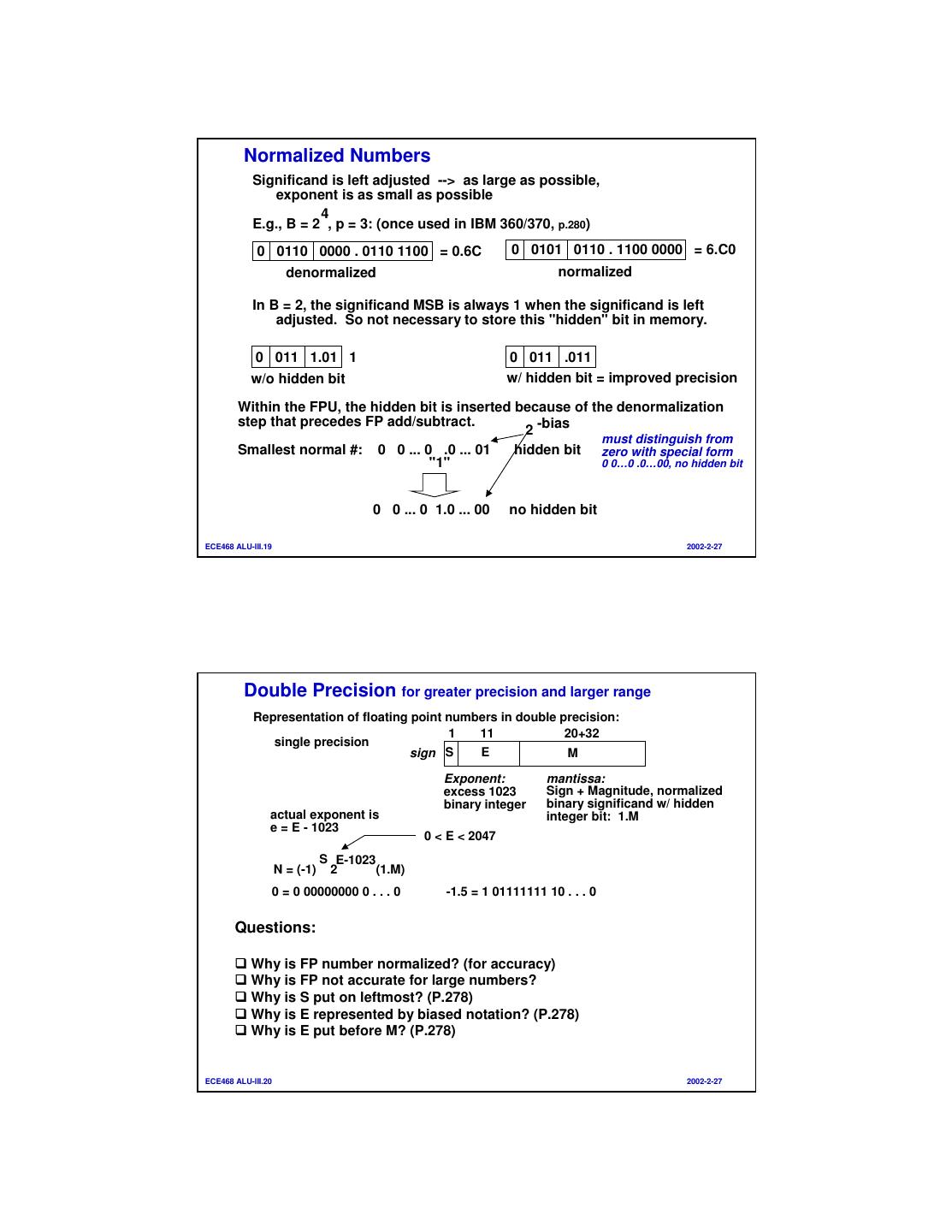 10 . Normalized Numbers Significand is left adjusted --> as large as possible, exponent is as small as possible 4 E.g., B = 2 , p = 3: (once used in IBM 360/370, p.280) 0 0110 0000 . 0110 1100 = 0.6C 0 0101 0110 . 1100 0000 = 6.C0 denormalized normalized In B = 2, the significand MSB is always 1 when the significand is left adjusted. So not necessary to store this "hidden" bit in memory. 0 011 1.01 1 0 011 .011 w/o hidden bit w/ hidden bit = improved precision Within the FPU, the hidden bit is inserted because of the denormalization step that precedes FP add/subtract. -bias 2 must distinguish from Smallest normal #: 0 0 ... 0 .0 ... 01 hidden bit zero with special form "1" 0 0…0 .0…00, no hidden bit 0 0 ... 0 1.0 ... 00 no hidden bit ECE468 ALU-III.19 2002-2-27 Double Precision for greater precision and larger range Representation of floating point numbers in double precision: 1 11 20+32 single precision sign S E M Exponent: mantissa: excess 1023 Sign + Magnitude, normalized binary integer binary significand w/ hidden actual exponent is integer bit: 1.M e = E - 1023 0 < E < 2047 S E-1023 N = (-1) 2 (1.M) 0 = 0 00000000 0 . . . 0 -1.5 = 1 01111111 10 . . . 0 Questions: Why is FP number normalized? (for accuracy) Why is FP not accurate for large numbers? Why is S put on leftmost? (P.278) Why is E represented by biased notation? (P.278) Why is E put before M? (P.278) ECE468 ALU-III.20 2002-2-27