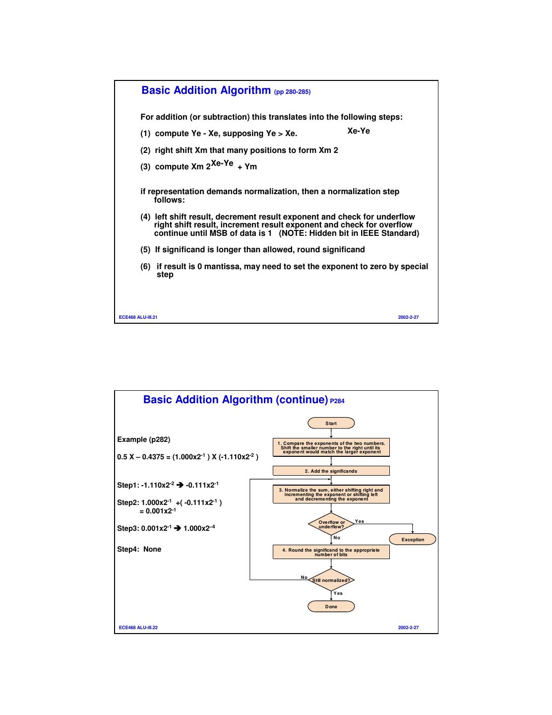 11 . Basic Addition Algorithm (pp 280-285) For addition (or subtraction) this translates into the following steps: (1) compute Ye - Xe, supposing Ye > Xe. Xe-Ye (2) right shift Xm that many positions to form Xm 2 (3) compute Xm 2 Xe-Ye + Ym if representation demands normalization, then a normalization step follows: (4) left shift result, decrement result exponent and check for underflow right shift result, increment result exponent and check for overflow continue until MSB of data is 1 (NOTE: Hidden bit in IEEE Standard) (5) If significand is longer than allowed, round significand (6) if result is 0 mantissa, may need to set the exponent to zero by special step ECE468 ALU-III.21 2002-2-27 Basic Addition Algorithm (continue) P284 S tart Example (p282) 1. Compare the exponents of the two numbers. Shift the smaller number to the right until its expone nt would match the larger exponent 0.5 X – 0.4375 = (1.000x2-1 )X (-1.110x2-2 ) 2 . Add the significands Step1: -1.110x2-2 -0.111x2-1 3. Normalize the sum, either shifting right and incrementing the exponent or shifting left and decreme nting the expone nt Step2: 1.000x2-1 +( -0.111x2-1 ) = 0.001x2-1 Ove rflow or Y es unde rflow? Step3: 0.001x2-1 1.000x2–4 No Exception Step4: None 4. Round the significand to the appropriate numbe r of bits No Still normalized? Y es D one ECE468 ALU-III.22 2002-2-27