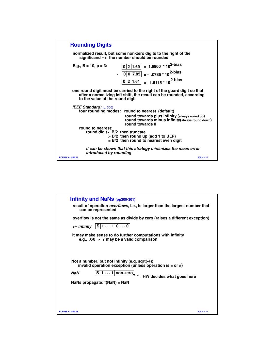 13 . Rounding Digits normalized result, but some non-zero digits to the right of the significand --> the number should be rounded E.g., B = 10, p = 3: 2-bias 0 2 1.69 = 1.6900 * 10 - 0 0 7.85 = - .0785 * 10 2-bias 0 2 1.61 = 1.6115 * 10 2-bias one round digit must be carried to the right of the guard digit so that after a normalizing left shift, the result can be rounded, according to the value of the round digit IEEE Standard: (p. 300) four rounding modes: round to nearest (default) round towards plus infinity (always round up) round towards minus infinity(always round down) round towards 0 round to nearest: round digit < B/2 then truncate > B/2 then round up (add 1 to ULP) = B/2 then round to nearest even digit it can be shown that this strategy minimizes the mean error introduced by rounding ECE468 ALU-III.25 2002-2-27 Infinity and NaNs (pp300-301) result of operation overflows, i.e., is larger than the largest number that can be represented overflow is not the same as divide by zero (raises a different exception) +/- infinity S 1...1 0...0 It may make sense to do further computations with infinity e.g., X/0 > Y may be a valid comparison Not a number, but not infinity (e.q. sqrt(-4)) invalid operation exception (unless operation is = or =) NaN S 1 . . . 1 non-zero HW decides what goes here NaNs propagate: f(NaN) = NaN ECE468 ALU-III.26 2002-2-27