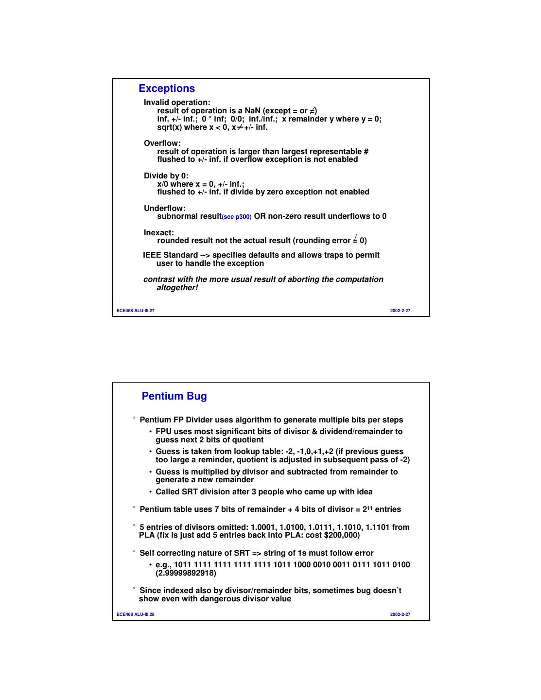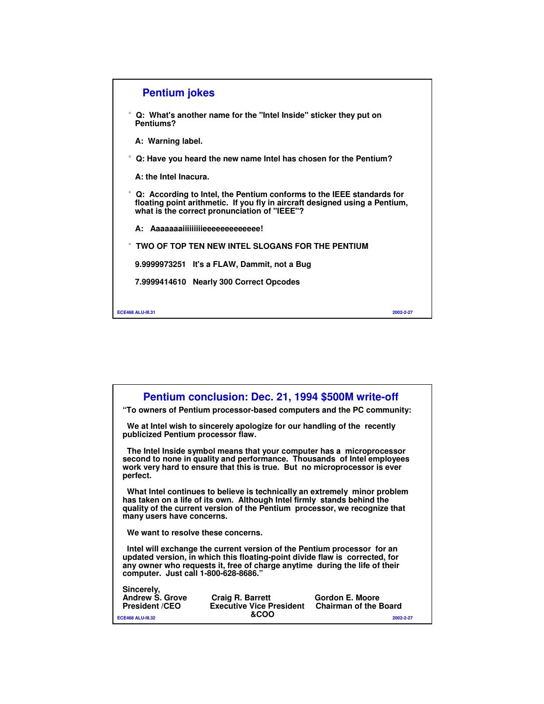 16 . Pentium jokes °Q: What's another name for the "Intel Inside" sticker they put on Pentiums? A: Warning label. °Q: Have you heard the new name Intel has chosen for the Pentium? A: the Intel Inacura. °Q: According to Intel, the Pentium conforms to the IEEE standards for floating point arithmetic. If you fly in aircraft designed using a Pentium, what is the correct pronunciation of "IEEE"? A: Aaaaaaaiiiiiiiiieeeeeeeeeeeee! °TWO OF TOP TEN NEW INTEL SLOGANS FOR THE PENTIUM 9.9999973251 It's a FLAW, Dammit, not a Bug 7.9999414610 Nearly 300 Correct Opcodes ECE468 ALU-III.31 2002-2-27 Pentium conclusion: Dec. 21, 1994 $500M write-off “To owners of Pentium processor-based computers and the PC community: We at Intel wish to sincerely apologize for our handling of the recently publicized Pentium processor flaw. The Intel Inside symbol means that your computer has a microprocessor second to none in quality and performance. Thousands of Intel employees work very hard to ensure that this is true. But no microprocessor is ever perfect. What Intel continues to believe is technically an extremely minor problem has taken on a life of its own. Although Intel firmly stands behind the quality of the current version of the Pentium processor, we recognize that many users have concerns. We want to resolve these concerns. Intel will exchange the current version of the Pentium processor for an updated version, in which this floating-point divide flaw is corrected, for any owner who requests it, free of charge anytime during the life of their computer. Just call 1-800-628-8686.” Sincerely, Andrew S. Grove Craig R. Barrett Gordon E. Moore President /CEO Executive Vice President Chairman of the Board ECE468 ALU-III.32 &COO 2002-2-27