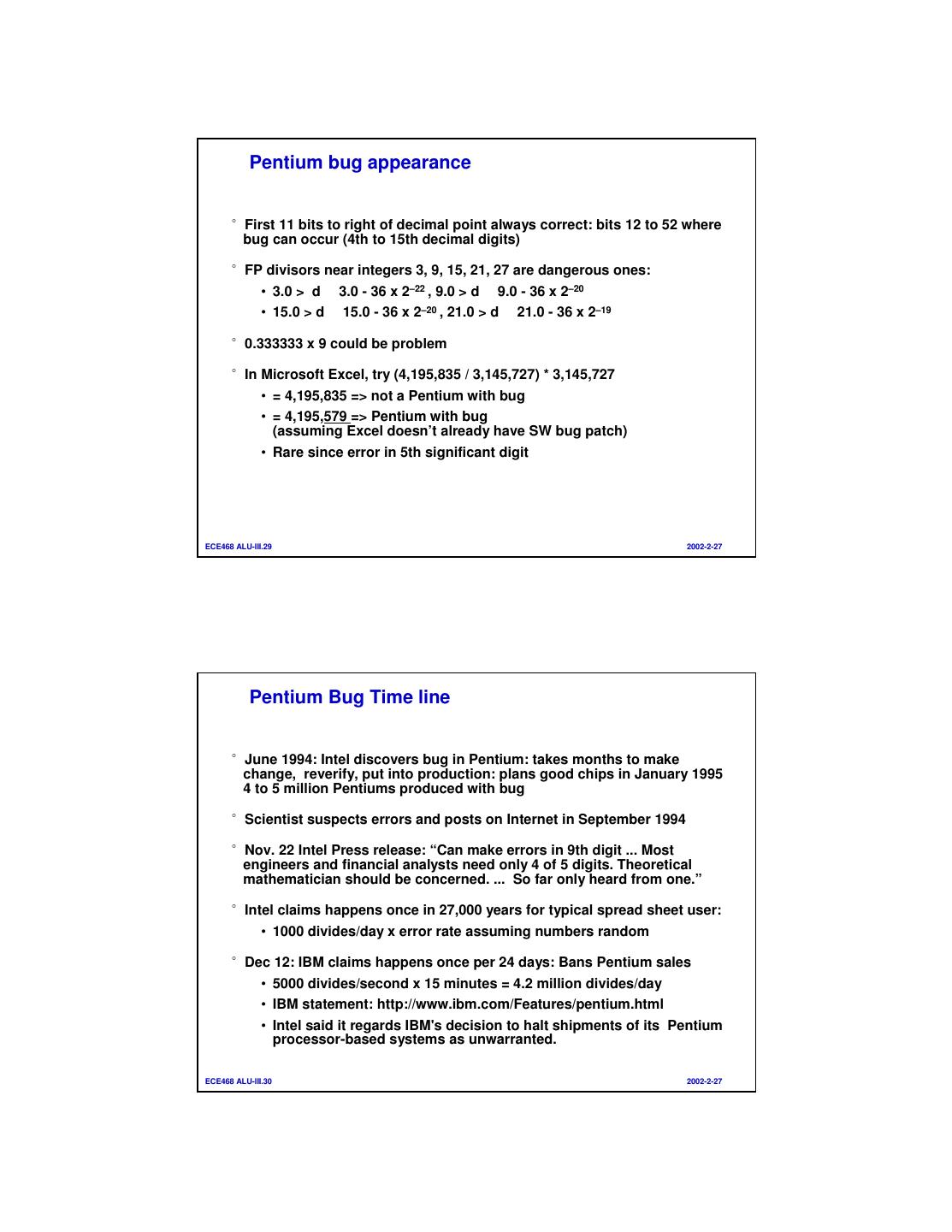 15 . Pentium bug appearance °First 11 bits to right of decimal point always correct: bits 12 to 52 where bug can occur (4th to 15th decimal digits) °FP divisors near integers 3, 9, 15, 21, 27 are dangerous ones: • 3.0 > d 3.0 - 36 x 2–22 , 9.0 > d 9.0 - 36 x 2–20 • 15.0 > d 15.0 - 36 x 2–20 , 21.0 > d 21.0 - 36 x 2–19 °0.333333 x 9 could be problem °In Microsoft Excel, try (4,195,835 / 3,145,727) * 3,145,727 • = 4,195,835 => not a Pentium with bug • = 4,195,579 => Pentium with bug (assuming Excel doesn’t already have SW bug patch) • Rare since error in 5th significant digit ECE468 ALU-III.29 2002-2-27 Pentium Bug Time line °June 1994: Intel discovers bug in Pentium: takes months to make change, reverify, put into production: plans good chips in January 1995 4 to 5 million Pentiums produced with bug °Scientist suspects errors and posts on Internet in September 1994 °Nov. 22 Intel Press release: “Can make errors in 9th digit ... Most engineers and financial analysts need only 4 of 5 digits. Theoretical mathematician should be concerned. ... So far only heard from one.” °Intel claims happens once in 27,000 years for typical spread sheet user: • 1000 divides/day x error rate assuming numbers random °Dec 12: IBM claims happens once per 24 days: Bans Pentium sales • 5000 divides/second x 15 minutes = 4.2 million divides/day • IBM statement: http://www.ibm.com/Features/pentium.html • Intel said it regards IBM's decision to halt shipments of its Pentium processor-based systems as unwarranted. ECE468 ALU-III.30 2002-2-27