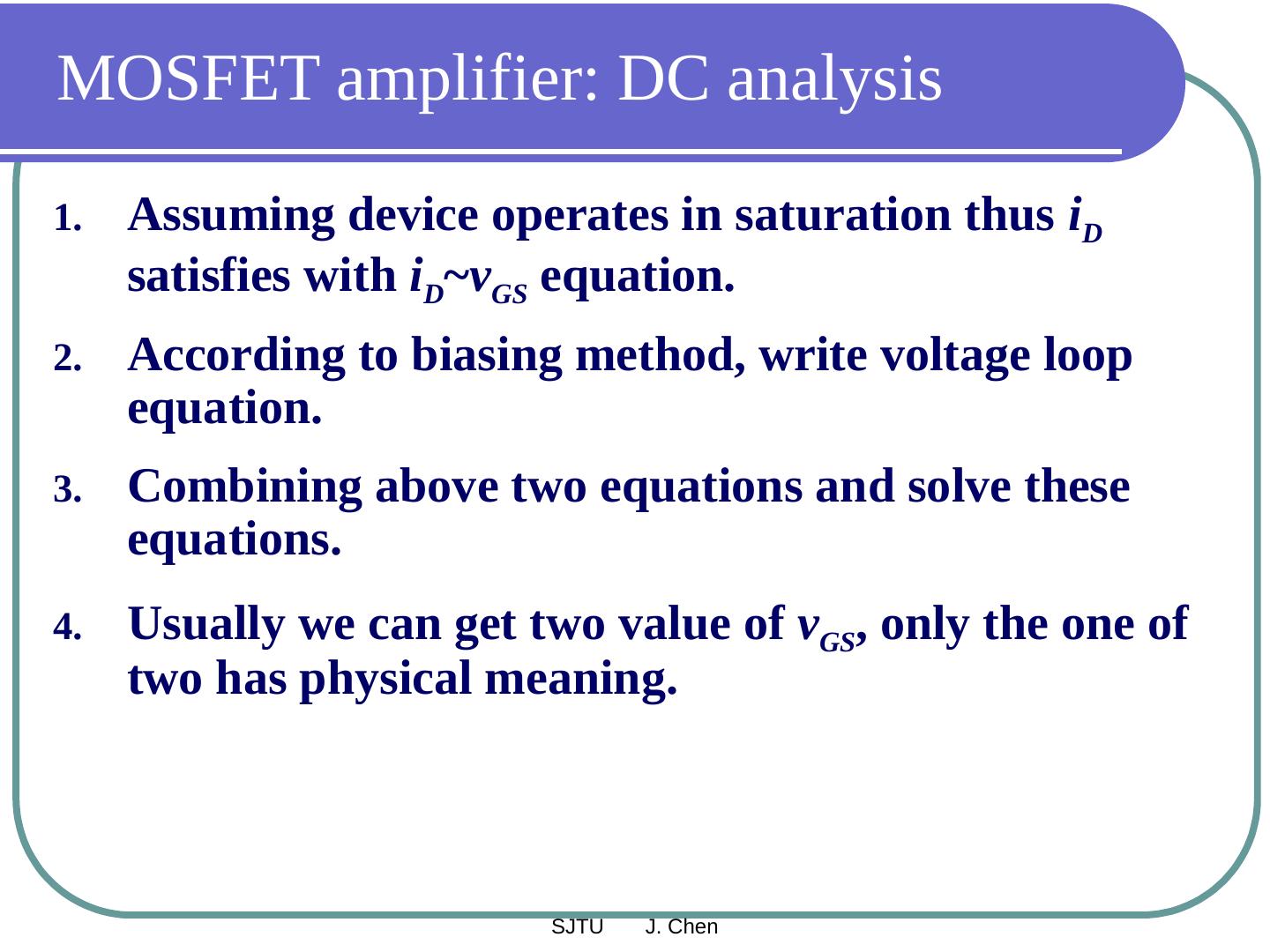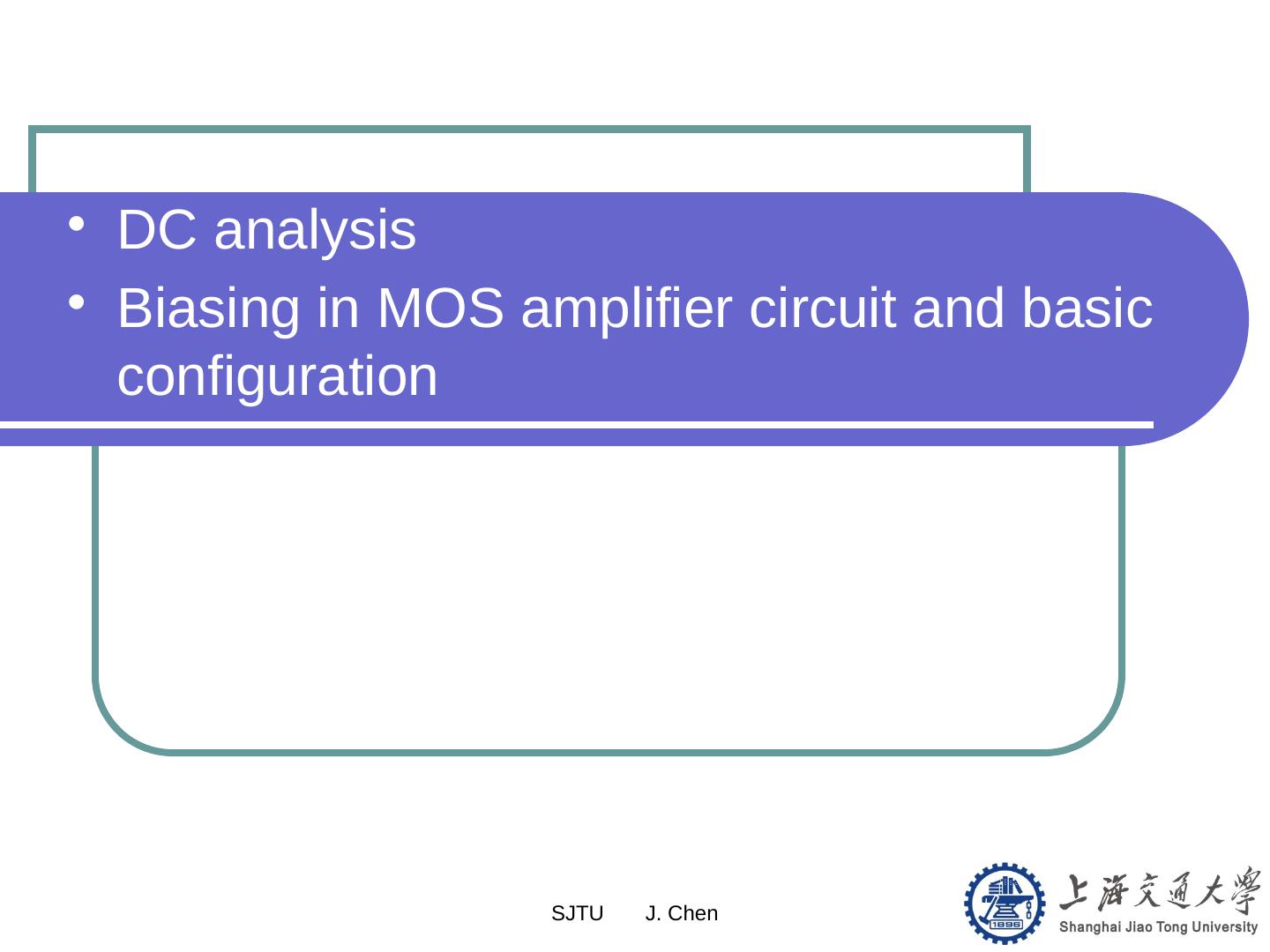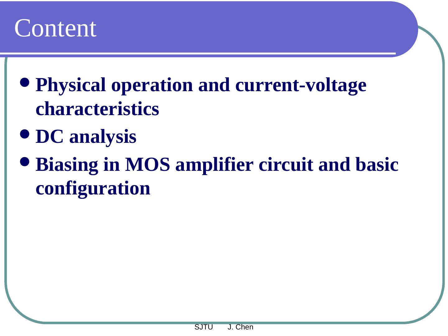 2 .SJTU J. Chen Content Physical operation and current-voltage characteristics DC analysis Biasing in MOS amplifier circuit and basic configuration