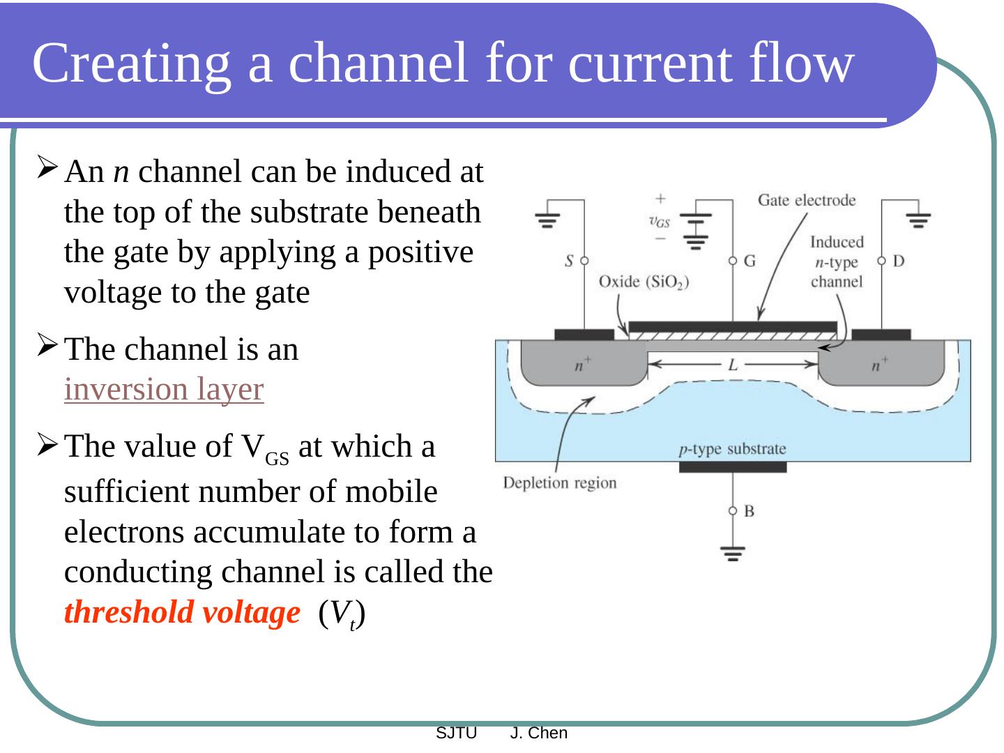 6 .SJTU J. Chen An n channel can be induced at the top of the substrate beneath the gate by appl y i ng a positive voltage to the gate The channel is an inversion layer The value of V GS at which a sufficient number of mobile electrons accumulate to form a conducting channel is c alled the threshold voltage ( V t ) Creating a channel for current flow