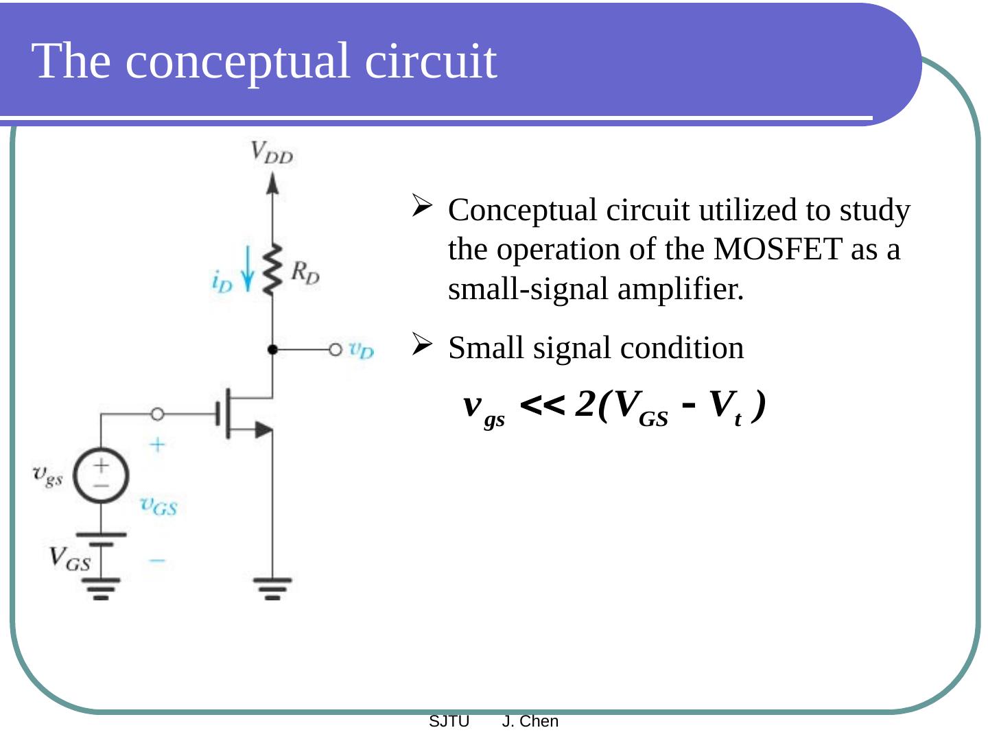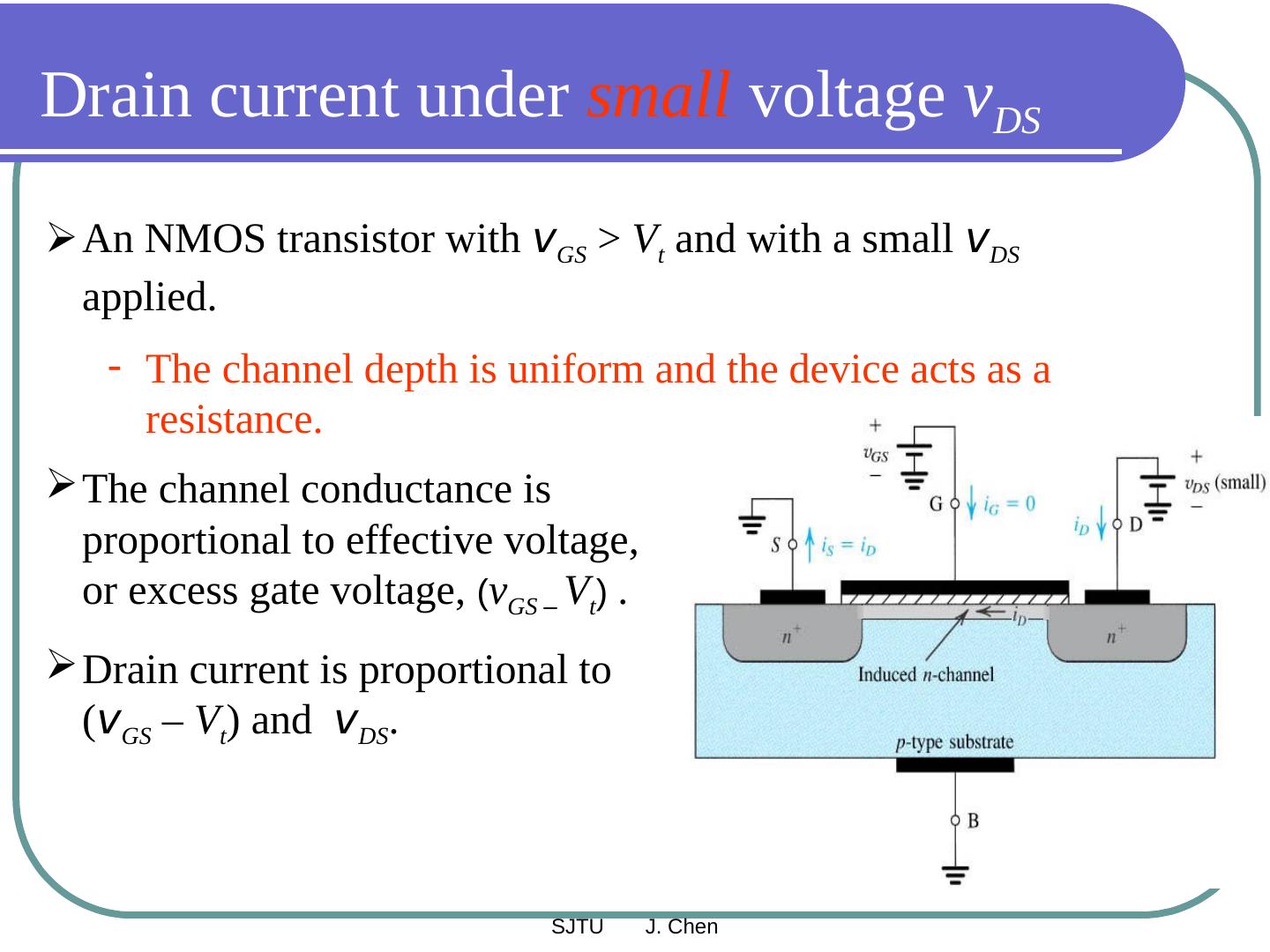 9 .SJTU J. Chen Drain current under small voltage v DS An NMOS transistor with v GS > V t and with a small v DS applied. The channel depth is uniform and t he device acts as a resistance. The channel conductance is proportional to effective voltage , or excess gate voltage, ( v GS – V t ) . Drain current is proportional to ( v GS – V t ) and v DS .