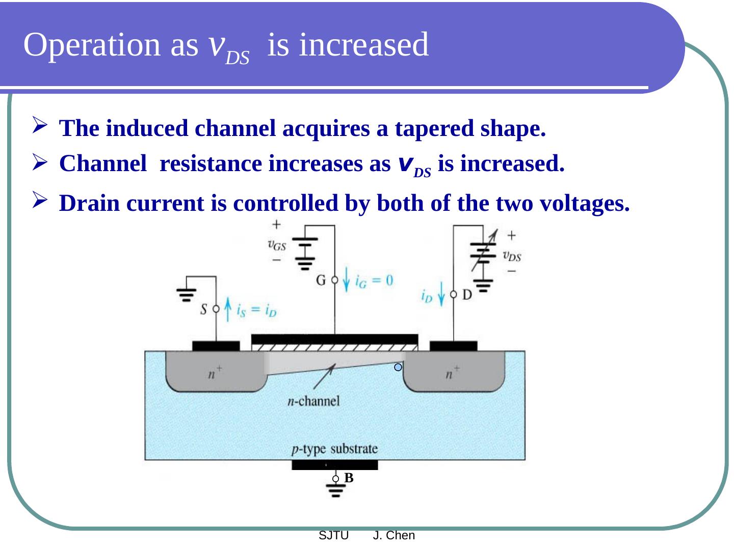 11 .SJTU J. Chen The induced channel acquires a tapered shape. Channel resistance increases as v DS is increased. Drain current is controlled by both of the two voltages. Operation as v DS is increased B