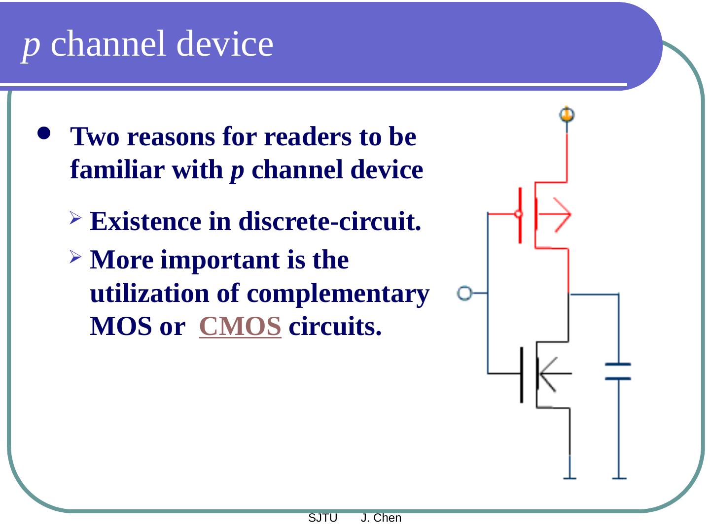 16 .SJTU J. Chen Two reasons for readers to be familiar with p channel device p channel device Existence in discrete-circuit. More important is the utilization of complementary MOS or CMOS circuits.
