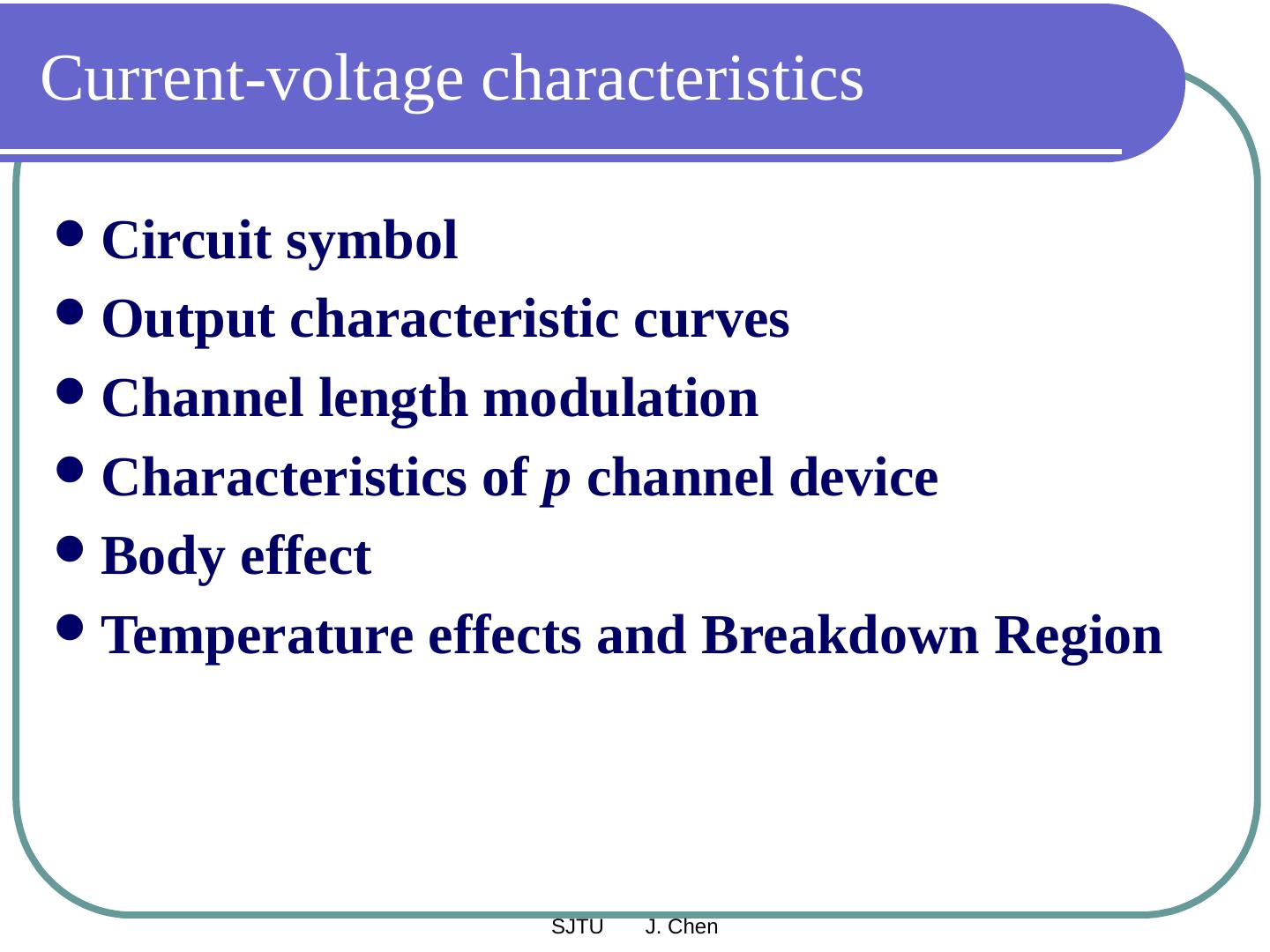 19 .SJTU J. Chen Circuit symbol Output characteristic curves Channel length modulation Characteristics of p channel device Body effect Temperature effects and Breakdown Region Current-voltage characteristics