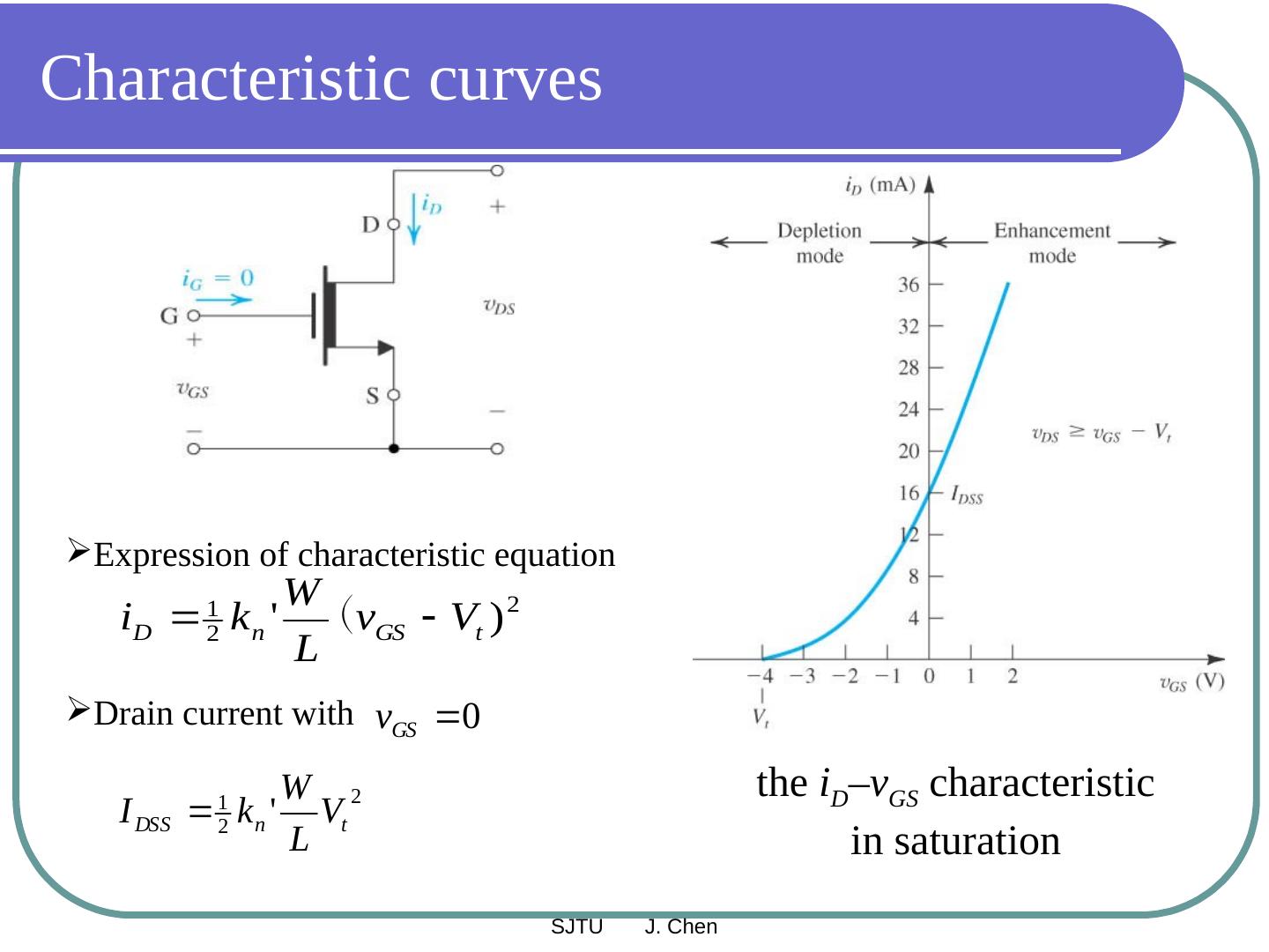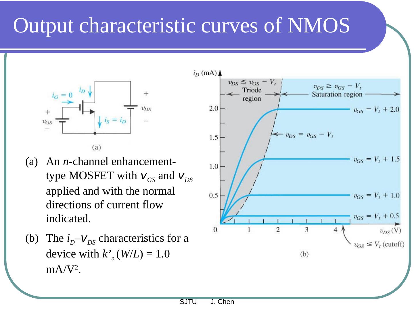 21 .SJTU J. Chen An n -channel enhancement-type MOSFET with v GS and v DS applied and with the normal directions of current flow indicated. The i D – v DS characteristics for a device with k’ n ( W / L ) = 1.0 mA/V 2 . Output characteristic curves of NMOS