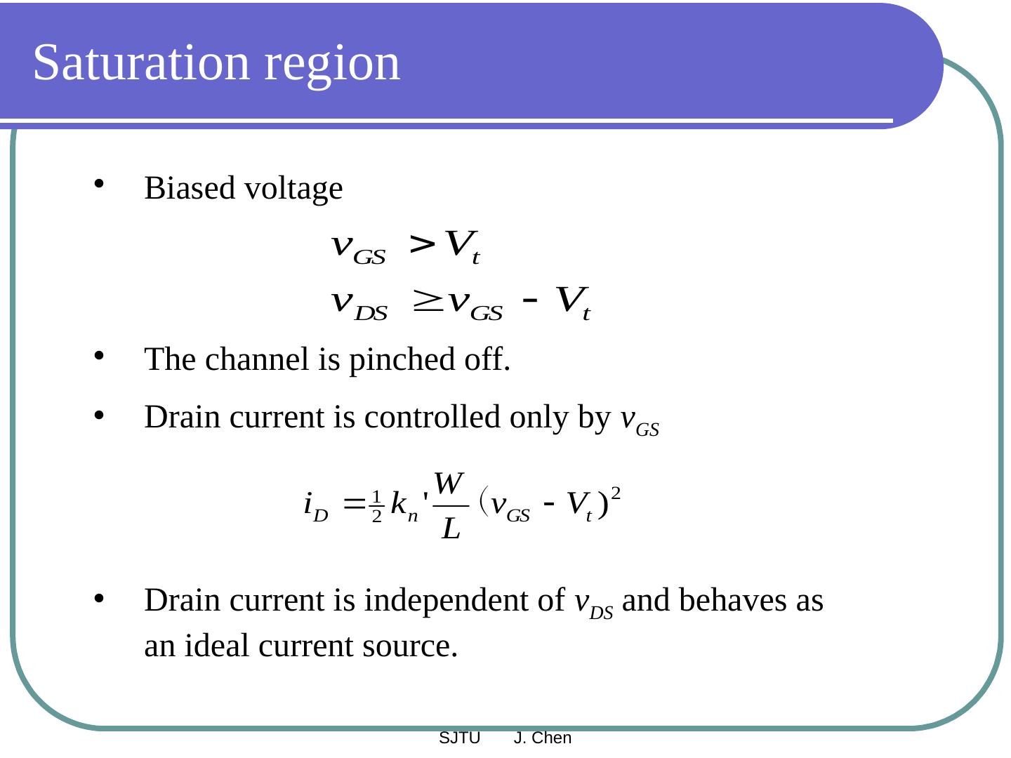 26 .SJTU J. Chen Biased voltage The channel is pinched off. Drain current is controlled only by v GS Drain current is independent of v DS and behaves as an ideal current source. Saturation r egion