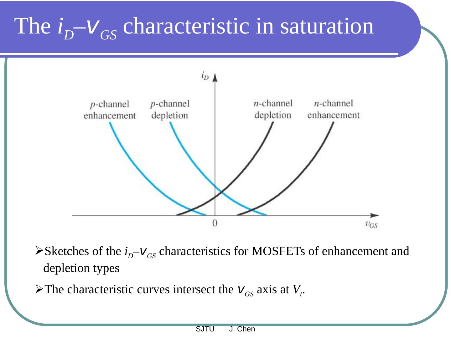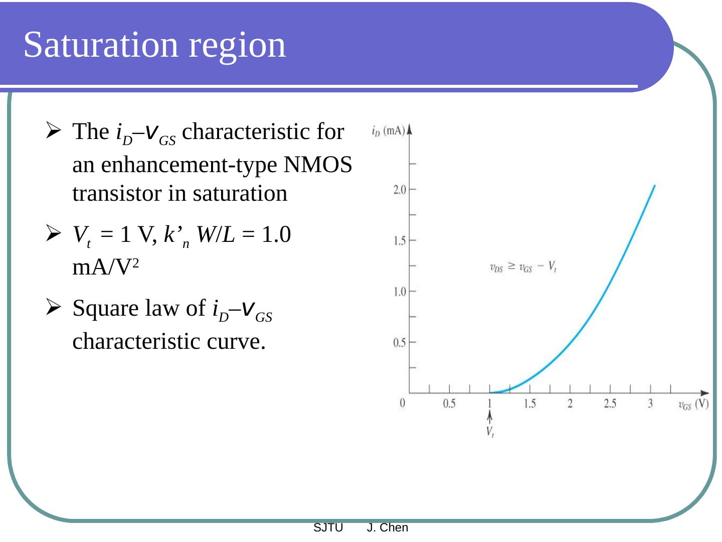 27 .SJTU J. Chen The i D – v GS characteristic for an enhancement-type NMOS transistor in saturation V t = 1 V, k’ n W / L = 1.0 mA/V 2 Square law of i D – v GS characteristic curve. Saturation r egion