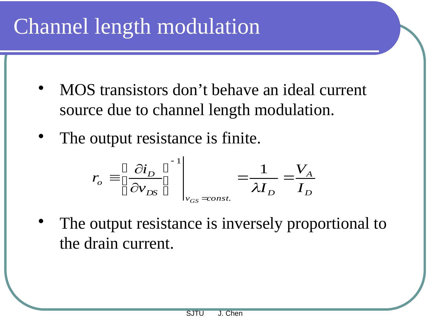 29 .SJTU J. Chen The MOSFET parameter V A depends on the process technology and, for a given process, is proportional to the channel length L . Channel l ength m odulation