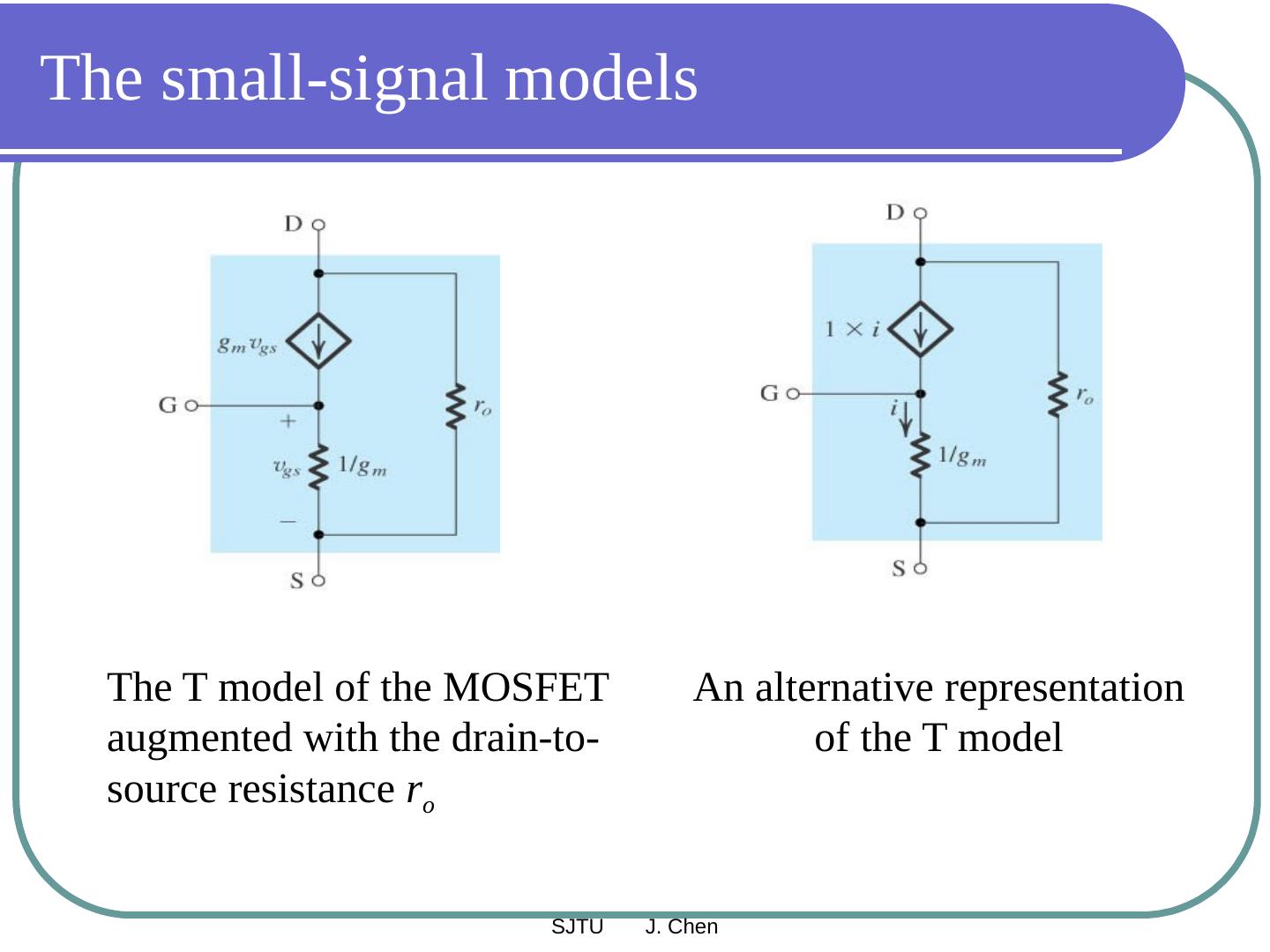 28 .SJTU J. Chen Explanation for channel length modulation Pinched point moves to source terminal with the voltage v DS increased. Effective channel length reduced Channel resistance decreased Drain current increases with the voltage v DS increased. Current drain is modified by the channel length modulation Channel l ength m odulation