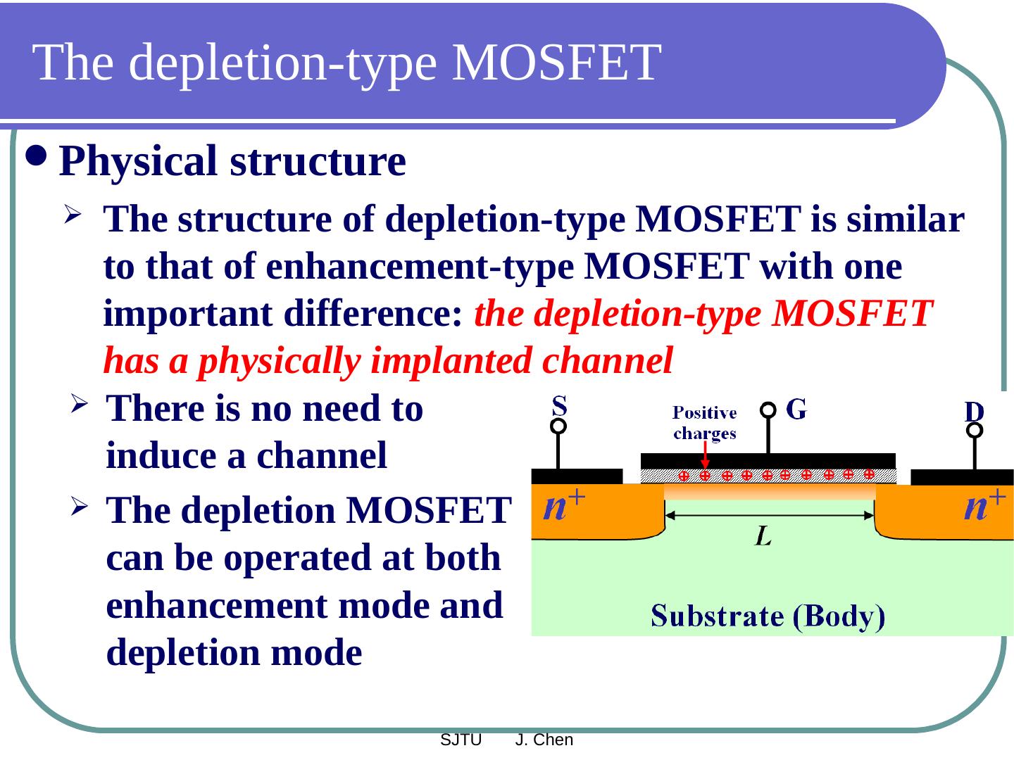 8 .SJTU J. Chen According to the type of the channel , FETs can be classified as MOSFET N channel P channel JFET P channel N channel Classification of FET Enhancement type Depletion type Enhancement type Depletion type
