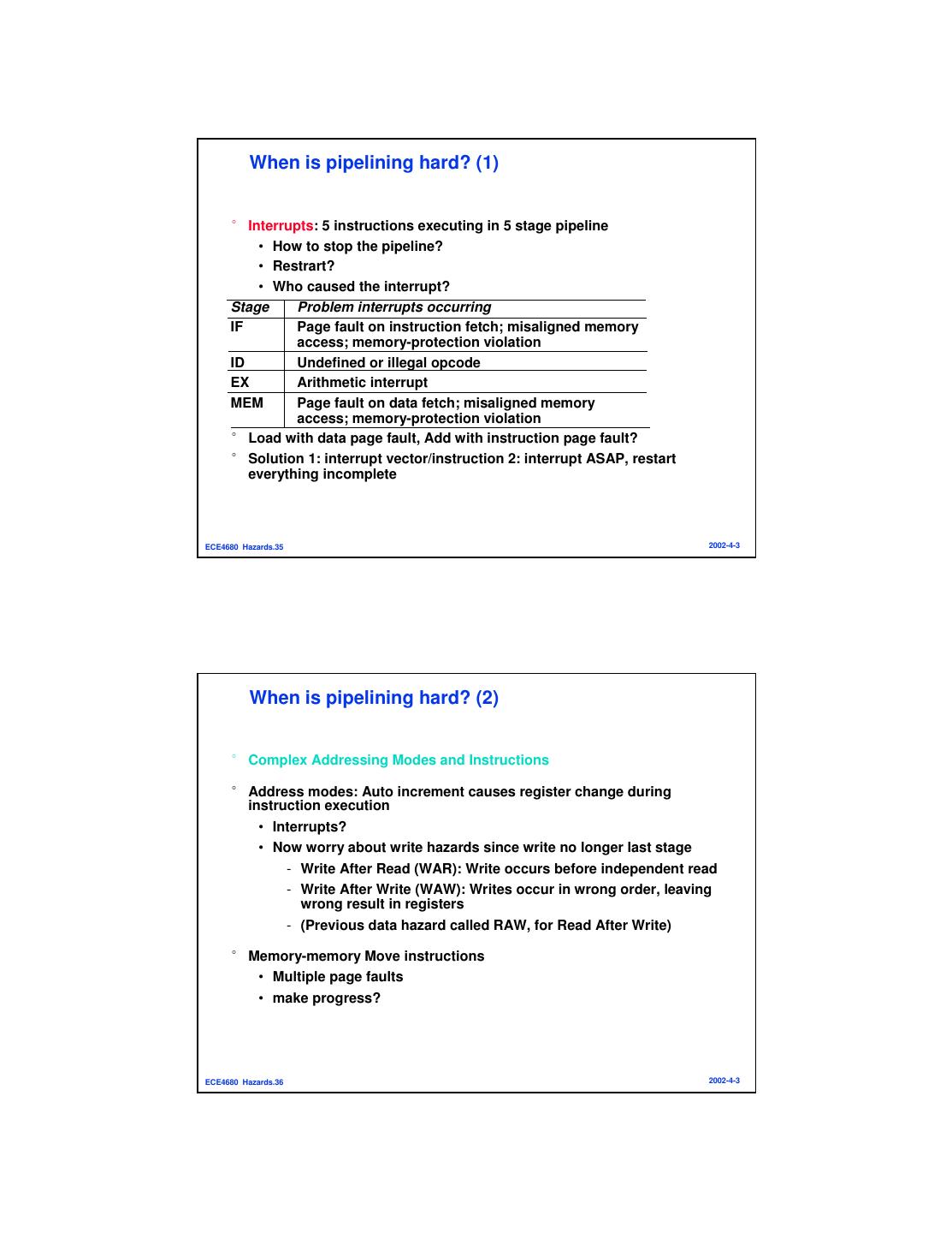 18 . When is pipelining hard? (1) ° Interrupts: 5 instructions executing in 5 stage pipeline • How to stop the pipeline? • Restrart? • Who caused the interrupt? Stage Problem interrupts occurring IF Page fault on instruction fetch; misaligned memory access; memory-protection violation ID Undefined or illegal opcode EX Arithmetic interrupt MEM Page fault on data fetch; misaligned memory access; memory-protection violation ° Load with data page fault, Add with instruction page fault? ° Solution 1: interrupt vector/instruction 2: interrupt ASAP, restart everything incomplete ECE4680 Hazards.35 2002-4-3 When is pipelining hard? (2) ° Complex Addressing Modes and Instructions ° Address modes: Auto increment causes register change during instruction execution • Interrupts? • Now worry about write hazards since write no longer last stage - Write After Read (WAR): Write occurs before independent read - Write After Write (WAW): Writes occur in wrong order, leaving wrong result in registers - (Previous data hazard called RAW, for Read After Write) ° Memory-memory Move instructions • Multiple page faults • make progress? ECE4680 Hazards.36 2002-4-3