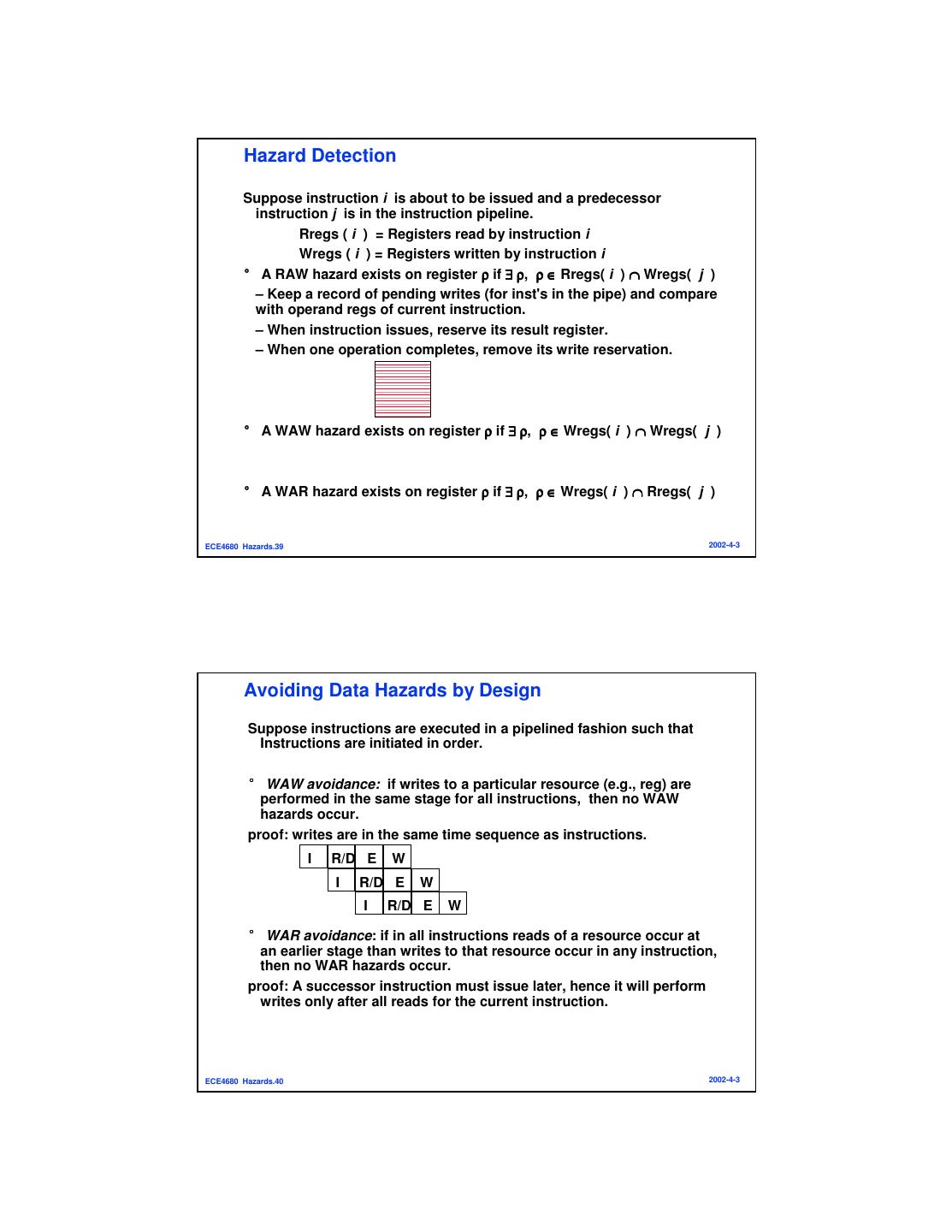 20 . Hazard Detection Suppose instruction i is about to be issued and a predecessor instruction j is in the instruction pipeline. Rregs ( i ) = Registers read by instruction i Wregs ( i ) = Registers written by instruction i ° A RAW hazard exists on register ρ if ∃ ρ, ρ ∈ Rregs( i ) ∩ Wregs( j ) – Keep a record of pending writes (for inst's in the pipe) and compare with operand regs of current instruction. – When instruction issues, reserve its result register. – When one operation completes, remove its write reservation. ° A WAW hazard exists on register ρ if ∃ ρ, ρ ∈ Wregs( i ) ∩ Wregs( j ) ° A WAR hazard exists on register ρ if ∃ ρ, ρ ∈ Wregs( i ) ∩ Rregs( j ) ECE4680 Hazards.39 2002-4-3 Avoiding Data Hazards by Design Suppose instructions are executed in a pipelined fashion such that Instructions are initiated in order. ° WAW avoidance: if writes to a particular resource (e.g., reg) are performed in the same stage for all instructions, then no WAW hazards occur. proof: writes are in the same time sequence as instructions. I R/D E W I R/D E W I R/D E W ° WAR avoidance: if in all instructions reads of a resource occur at an earlier stage than writes to that resource occur in any instruction, then no WAR hazards occur. proof: A successor instruction must issue later, hence it will perform writes only after all reads for the current instruction. ECE4680 Hazards.40 2002-4-3