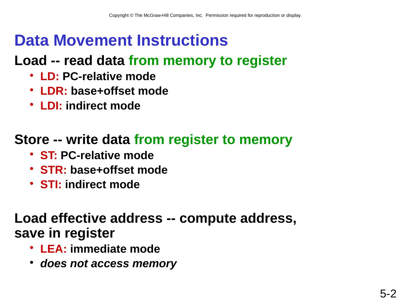 2 .5- 2 Data Movement Instructions Load -- read data from memory to register LD: PC-relative mode LDR: base+offset mode LDI: indirect mode Store -- write data from register to memory ST: PC-relative mode STR: base+offset mode STI: indirect mode Load effective address -- compute address, save in register LEA: immediate mode does not access memory