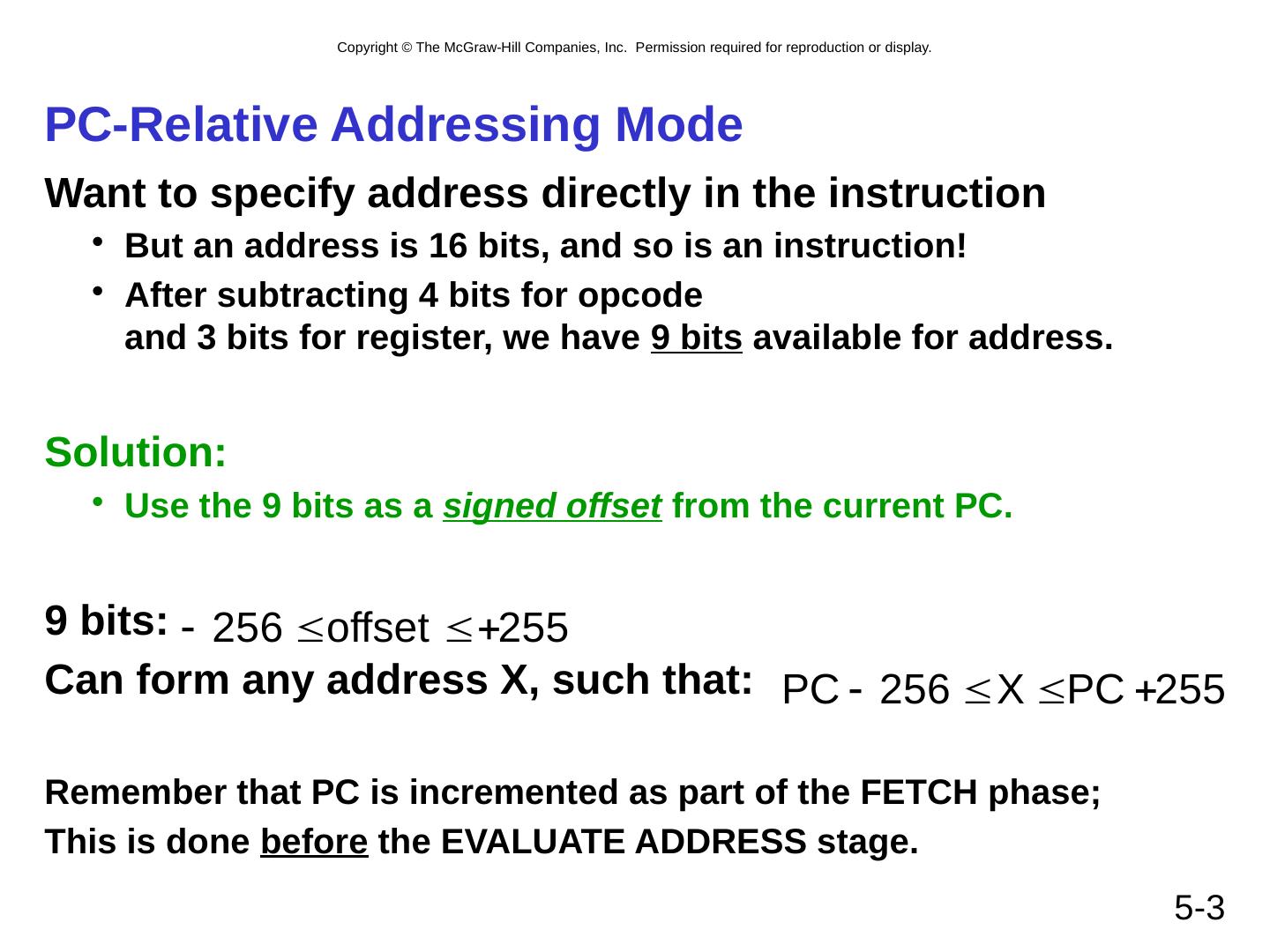 3 .5- 3 PC-Relative Addressing Mode Want to specify address directly in the instruction But an address is 16 bits, and so is an instruction! After subtracting 4 bits for opcode and 3 bits for register, we have 9 bits available for address. Solution: Use the 9 bits as a signed offset from the current PC. 9 bits: Can form any address X, such that: Remember that PC is incremented as part of the FETCH phase; This is done before the EVALUATE ADDRESS stage.