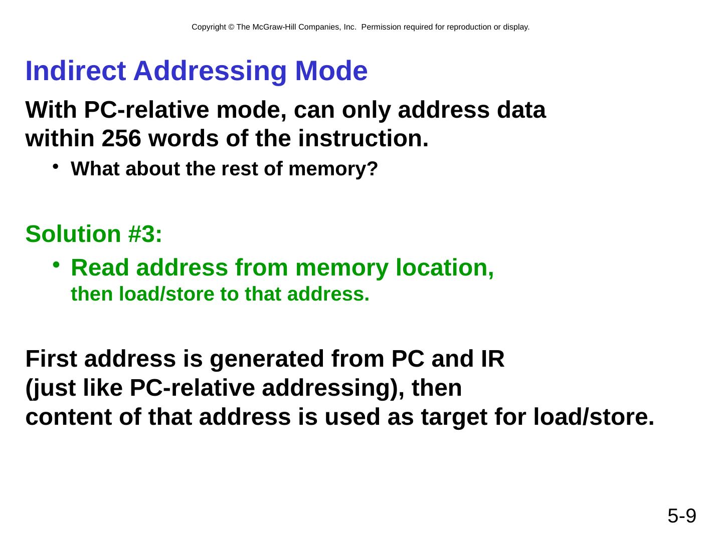 9 .5- 9 Indirect Addressing Mode With PC-relative mode, can only address data within 256 words of the instruction. What about the rest of memory? Solution #3: Read address from memory location, then load/store to that address. First address is generated from PC and IR (just like PC-relative addressing), then content of that address is used as target for load/store.