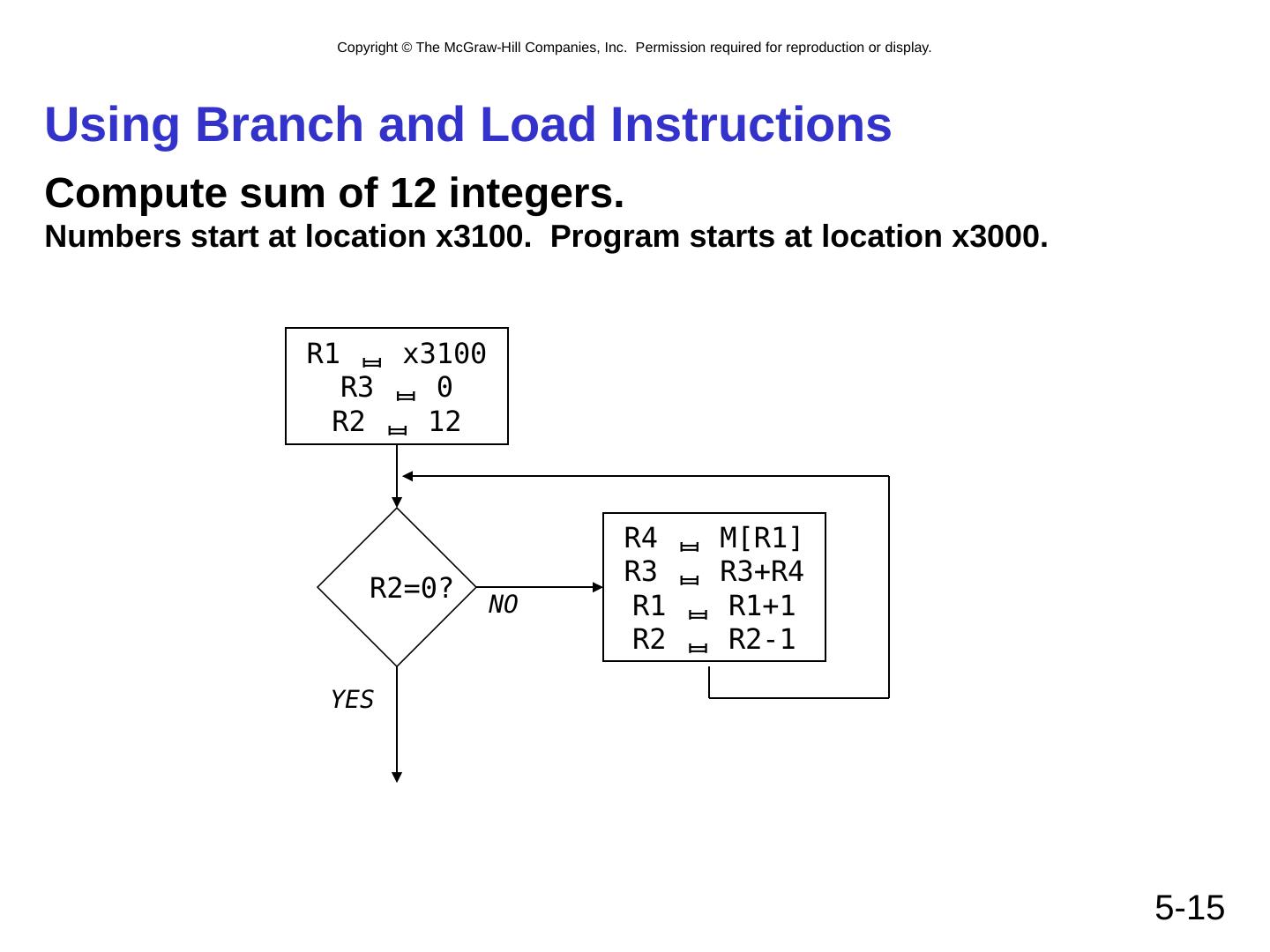 15 .5- 15 Using Branch and Load Instructions Compute sum of 12 integers. Numbers start at location x3100. Program starts at location x3000. R1 x3100 R3 0 R2 12 R2=0? R4 M[R1] R3 R3+R4 R1 R1+1 R2 R2-1 NO YES
