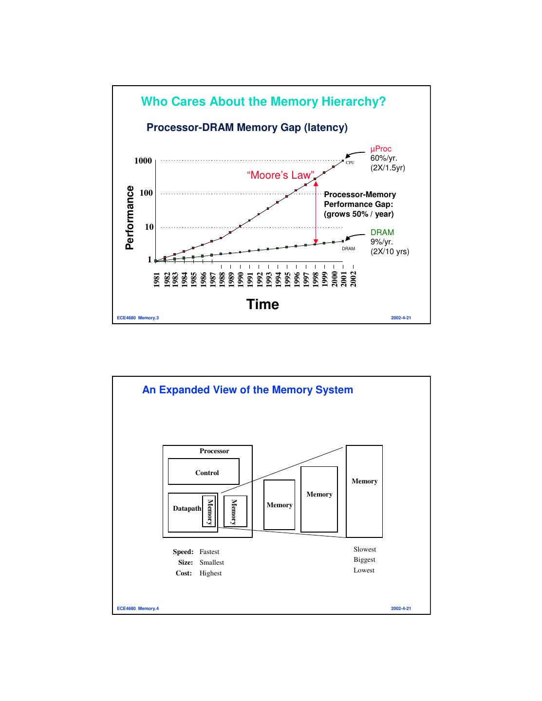 1 . ECE4680 Computer Organization and Architecture Memory Hierarchy ECE4680 Memory.1 2002-4-21 The Big Picture: Where are We Now? °The Five Classic Components of a Computer Processor Input Control Memory Datapath Output °Today’s Topic: Memory System ECE4680 Memory.2 2002-4-21