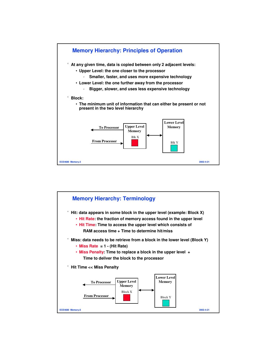 3 . Memory Hierarchy: Principles of Operation °At any given time, data is copied between only 2 adjacent levels: • Upper Level: the one closer to the processor - Smaller, faster, and uses more expensive technology • Lower Level: the one further away from the processor - Bigger, slower, and uses less expensive technology °Block: • The minimum unit of information that can either be present or not present in the two level hierarchy Lower Level To Processor Upper Level Memory Memory Blk X From Processor Blk Y ECE4680 Memory.5 2002-4-21 Memory Hierarchy: Terminology °Hit: data appears in some block in the upper level (example: Block X) • Hit Rate: the fraction of memory access found in the upper level • Hit Time: Time to access the upper level which consists of RAM access time + Time to determine hit/miss °Miss: data needs to be retrieve from a block in the lower level (Block Y) • Miss Rate = 1 - (Hit Rate) • Miss Penalty: Time to replace a block in the upper level + Time to deliver the block to the processor °Hit Time << Miss Penalty Lower Level To Processor Upper Level Memory Memory Block X From Processor Block Y ECE4680 Memory.6 2002-4-21