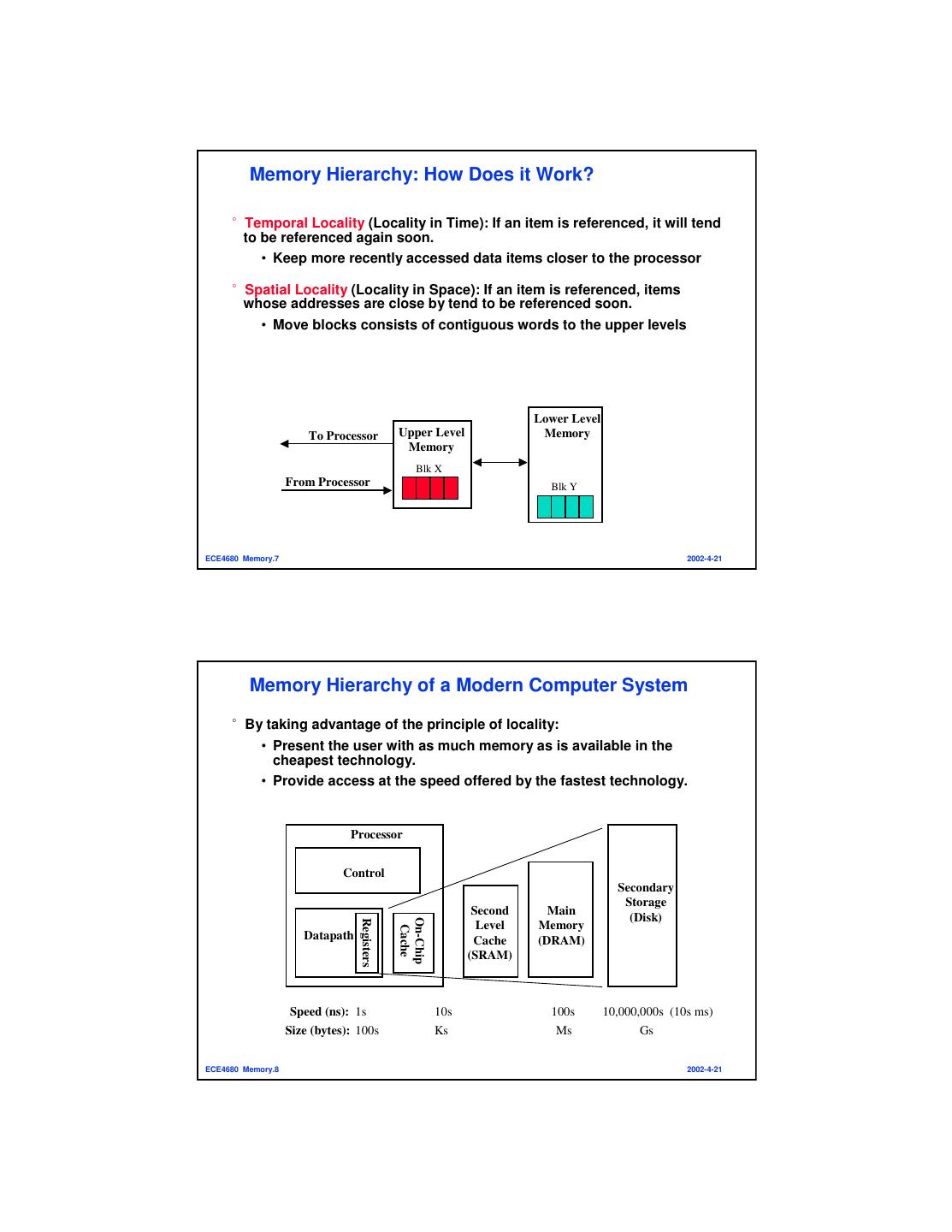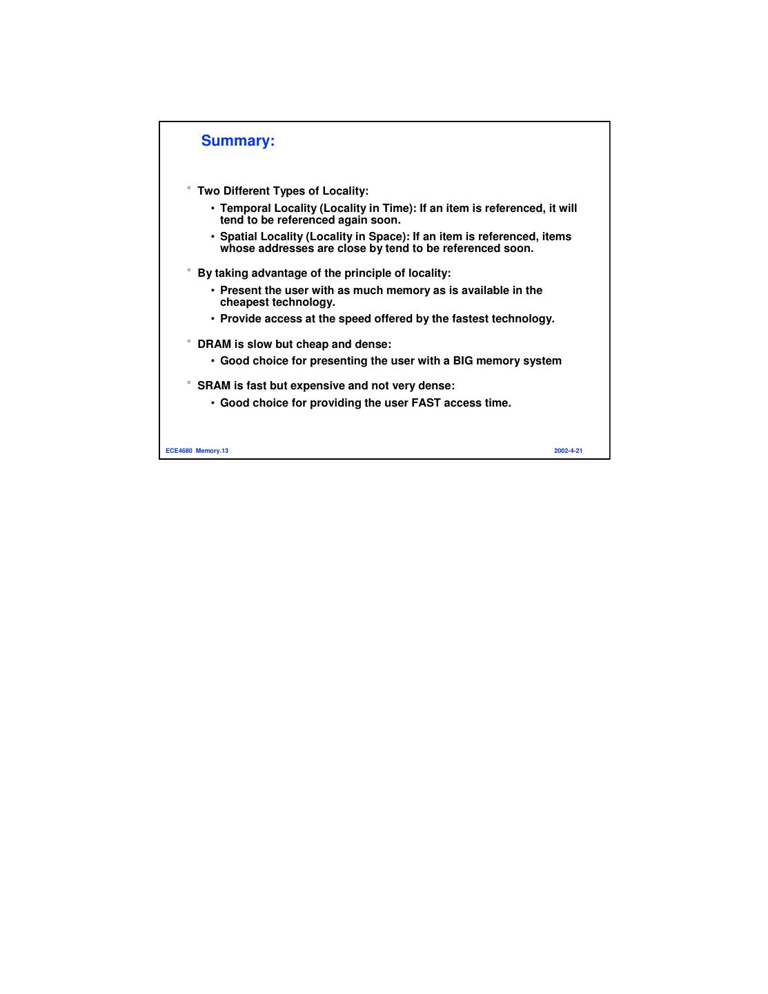7 . Summary: °Two Different Types of Locality: • Temporal Locality (Locality in Time): If an item is referenced, it will tend to be referenced again soon. • Spatial Locality (Locality in Space): If an item is referenced, items whose addresses are close by tend to be referenced soon. °By taking advantage of the principle of locality: • Present the user with as much memory as is available in the cheapest technology. • Provide access at the speed offered by the fastest technology. °DRAM is slow but cheap and dense: • Good choice for presenting the user with a BIG memory system °SRAM is fast but expensive and not very dense: • Good choice for providing the user FAST access time. ECE4680 Memory.13 2002-4-21