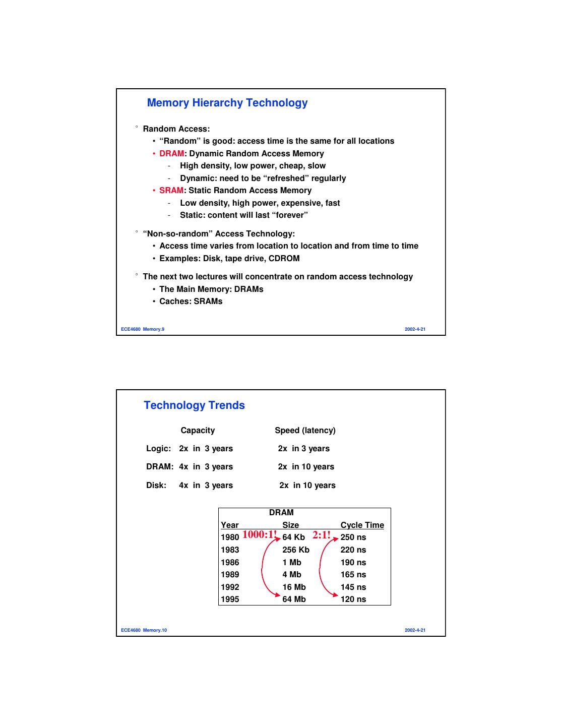 5 . Memory Hierarchy Technology °Random Access: • “Random” is good: access time is the same for all locations • DRAM: Dynamic Random Access Memory - High density, low power, cheap, slow - Dynamic: need to be “refreshed” regularly • SRAM: Static Random Access Memory - Low density, high power, expensive, fast - Static: content will last “forever” °“Non-so-random” Access Technology: • Access time varies from location to location and from time to time • Examples: Disk, tape drive, CDROM °The next two lectures will concentrate on random access technology • The Main Memory: DRAMs • Caches: SRAMs ECE4680 Memory.9 2002-4-21 Technology Trends Capacity Speed (latency) Logic: 2x in 3 years 2x in 3 years DRAM: 4x in 3 years 2x in 10 years Disk: 4x in 3 years 2x in 10 years DRAM Year Size Cycle Time 1980 1000:1! 64 Kb 2:1! 250 ns 1983 256 Kb 220 ns 1986 1 Mb 190 ns 1989 4 Mb 165 ns 1992 16 Mb 145 ns 1995 64 Mb 120 ns ECE4680 Memory.10 2002-4-21